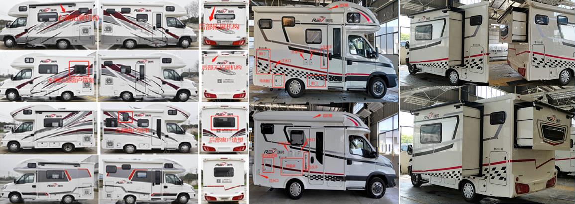 该车装备桌椅、睡具、炊具、卫生设施以及必要的照明和空气调节设施等旅居生活专用装置。旅居车左侧车厢可选择左右扩展,后侧车厢可选择前后扩展,行驶过程中左侧扩展机构、后部扩展机构不可打开。选装彩贴样式、不同内饰、后爬梯、太阳能板、顶置空调、野餐桌位置、可不带360摄像头、乘客门造型、乘客门位置、乘客门上车扶手、出水口位置、注水口造型及位置、舱门位置、外接市电口造型及位置、盒式座便器位置、左侧窗户造型及位置、左侧子母床窗户造型、右侧窗户造型及位置、后保造型、后部窗户大小及造型、左右侧推拉窗样式。随底盘选装红色格栅和镀铬格栅、轮罩。选装小额头造型,整车高度为2980mm,整车宽度为2432mm;选装不带左侧车厢扩展时整车宽为2420mm;整备质量为3700kg时,对应的额定载客4,5,6人;整备质量为3900kg时,对应额定载客5,6人;整备质量为4050kg时,对应额定载客5,6人;整备质量为4218kg时,对应额定载客4人;侧面及后部防护均采用裙板式结构。ABS系统控制器型号:BOSCH ABS9、BOSCH ESP9,ABS系统控制器生产企业:BOSCH。1、装备F1AE8481D发动机时,发动机最大净功率93kW;2、装备F1CE8481K发动机时,发动机最大净功率123kW。该车型可选装ETC车载装置。 |