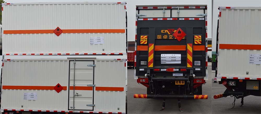 该车为危险货物运输车辆;厢体顶部封闭,不可开启;货厢侧面选装无侧门,选装侧门可为单开门或双开门,选装侧门型式及位置;该车运输具有独立容器包装的易燃气体,运输介质类项号:2.1;运输具有独立容器包装的非易燃无毒气体,类项号2.2;危险货物运输车种类:FL;防护装置材料均为Q235,连接方式均为螺栓连接,后部防护装置断面尺寸为120×70mm,离地高度为440mm;仅选装安装有ABS的底盘,ABS系统控制器型号/生产企业:ABS-E/威伯科汽车控制系统(中国)有限公司,ABS-VI·E/广州瑞立科密汽车电子股份有限公司;仅选用安装有前轮盘式制动器,排气管前置的底盘;该车装备有限速装置,限速80km/h;该车仅使用子午线轮胎;安装具有卫星定位功能的行驶记录仪;仅选用发动机F3.8NS6B156对应的最大净功率/油耗值:112kw/21.0L/100km;仅选用3800轴距.选装液压尾板时,后防护装置材料为Q235B,连接方式为螺栓连接,后部防护装置截面尺寸为Φ120mm,离地高度为420mm;液压尾板收起状态水平长度为295mm;尾板质量为450kg;转向轮安装轮胎爆胎应急防护装置;选装ETC车载装置; |