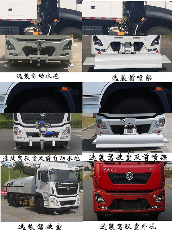 仅选用4350+1350mm轴距;罐体外形:长轴×短轴×长度(mm):2300×1450×5700,罐体有效容积:12.87立方米;该车有6种配置:配置A(标配)、配置B(选装前自动水炮)、配置C(选装前喷架)、配置D(选装驾驶室)、配置E(选装驾驶室及前自动水炮)、配置F(选装驾驶室及前喷架);各配置整备质量(kg)/载质量(kg)/整车长度(mm)/整车高度(mm)/前悬(mm)如下:配置A:12430/12440/10155/3160/1480;配置B:12430/12440/10605/3160/1930;配置C:12610/12260/11055/3160/2380;配置D:12040/12830/10175/3100/1500;配置E:12040/12830/10605/3100/1930; 配置F:12220/12650/11055/3100/2380;以上六种配置均可选装:1、后上喷雾装置;2、后下喷雾装置; 3、加宽平台;4、下水道疏通装置;5、左右侧浇花装置; 6、后部作业指示灯;配置C、F可选装自动水炮;随底盘选装驾驶室外观;侧防护装置的材料材质:Q235B,连接方式为螺栓连接,后防护装置的材料材质:Q235A,连接方式为螺栓连接,后部防护装置的断面尺寸(宽×高)mm:60×230,离地高度480mm;ABS型号/生产企业:3631010-C2000/东科克诺尔商用车制动系统(十堰)有限公司,ABSE4S/4M/威伯科汽车控制系统(中国)有限公司;该车装备有罐体,水泵,管道系统等,用于清洗路面,对路面喷洒水降尘等作用。 |