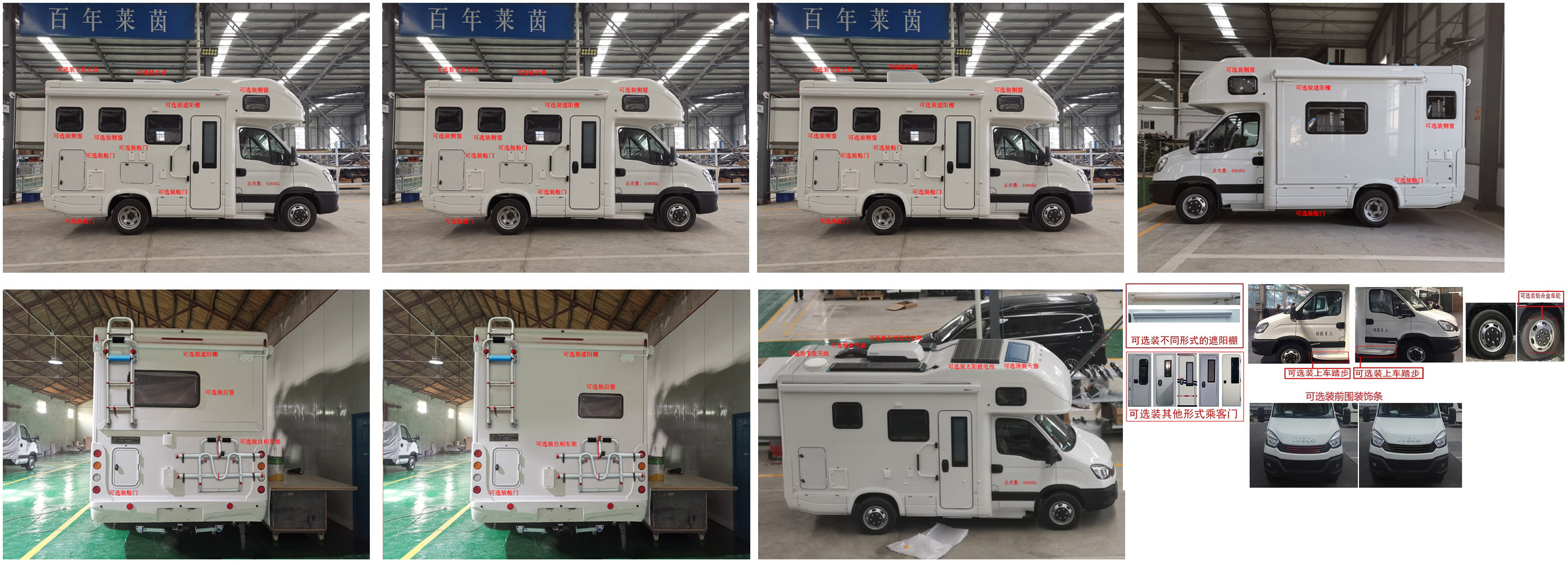 ABS型号:BOSCH ABS9,BOSCH ESP9;ABS生产企业:BOSCH公司,BOSCH公司;发动机净功率值:装F1AE8481D发动机时,发动机最大净功率93KW;装F1CE8481K发动机时,发动机最大净功率123kW;选装描述:选装高配时对应整备质量为4030kg,选装中配时对应整备质量为3960kg或3850kg,选装简配时对应整备质量为3750kg;选装不同形式空调时整车高度为:3280mm,3090mm,2855mm;车身两侧均选装遮阳棚时对应整车宽度为2440mm,单侧选装遮阳棚时对应整车宽度为2340mm,两侧取消遮阳棚时对应整车宽度为2240mm;车身两侧可选装不同型式侧窗、侧舱门,车身后部可选装不同形式后窗、车辆顶部可选装换气窗、顶风窗、太阳能电池、卫星天线;该车可选装后爬梯、自行车架、不同型式的遮阳棚、乘客门;该车可选装不同型式的正副司机门上车踏步;车内可选装电磁炉;随原车选装铝合金车轮、红色格栅和镀铬格栅;车辆左侧可选装仅在未行驶状态下使用的拓展舱,车辆后部可选装仅在未行驶状态下使用的拓展舱;该车侧后防护为裙板结构,侧防护下边缘离地高度:360mm,后防护下边缘离地高度:490mm;可选侧防护下边缘离地高度:280mm,后防护下边缘离地高度:390mm时并选装后部灯具.专用功能及装置:该车配备卧具、厨具、卫生设施等旅居生活设施,用于旅行宿营. |