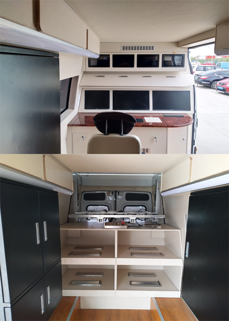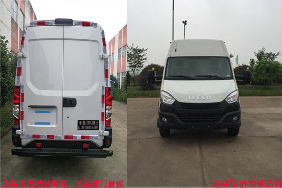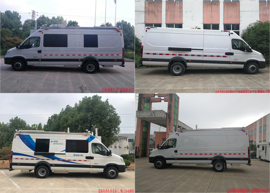 车内设置工作台,工作椅,设备柜,监视器,电源及控制系统等专用设备,该车主要用于国家电网维护移动作业服务,车辆行驶中工作椅不载人.车顶可选装取消工作平台,摄像机,天线.整车高度2841mm,选装车顶设备高度3100mm.选装顶置空调,场地照明灯.选装取消后部爬梯,车身设备门,前额凸台,侧门自动踏板.选装两侧和后门盲窗的钣金结构.侧面防护装置为裙边式围板防护,侧防护离地高度:470mm;后下部防护装置由车身结构件代替,后防护离地高度:415mm.ABS系统控制器型号:BO SCH ABS9,ABS系统控制器生产企业:BO SCH 公司.发动机最大净功率105kW. |