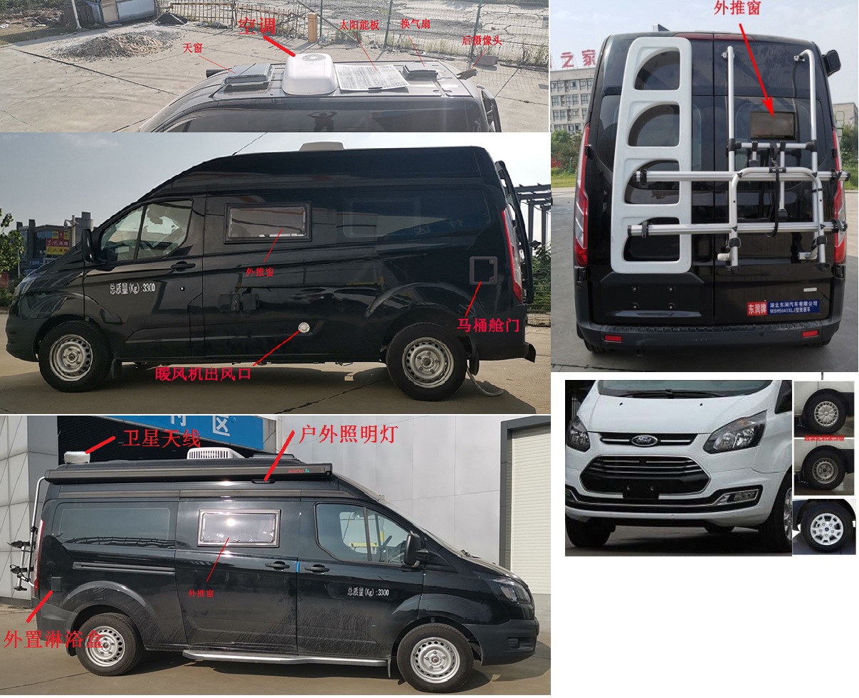 ABS型号:EV5051;ABS生产企业:博世汽车部件(苏州)有限公司;发动机净功率值:147;选装描述:选装暖风机出风口、加油口、马桶舱门、卫星天线、外置淋浴盒、天窗、太阳能板、换气扇、后摄像头、外推窗、户外照明灯,随底盘选装轮辋样式、前脸;车厢顶部封闭且不可开启;其他说明:车辆配备有空调,卧具,餐饮及炊事设施,淋浴设施,卫生间,储藏设施,照明设施.随底盘选装中顶车高2407mm,安装换气扇车高2487mm和2512mm,安装卫星天线车高2560mm,安装顶置空调车高2622mm、2687mm.安装自行车架车长5550mm,对应前悬/后悬1014mm/1236mm.安装后爬梯车长5391mm,对应前悬/后悬1014mm/1077mm.不安装后爬梯及自行车架时车长5341mm,对应前悬/后悬1014mm/1027mm.选装侧拉门踏板车宽为2085mm.该车型可选装ETC车载装置; |