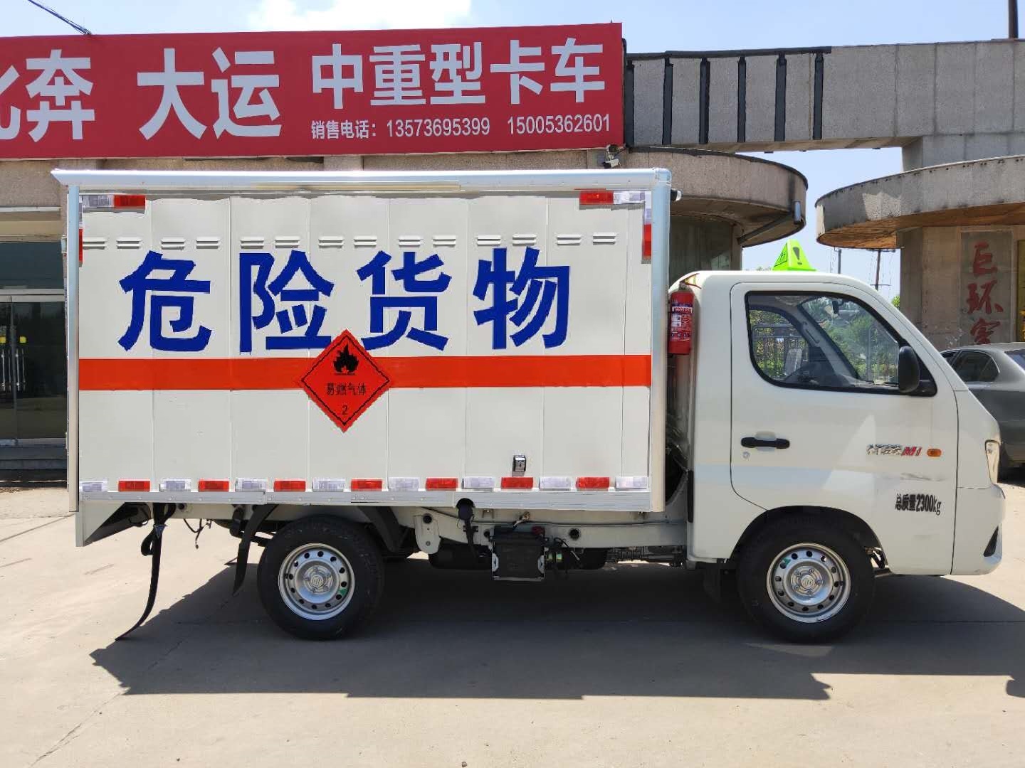 厢体顶部封闭,不可开启。该车用于运输具有独立容器(瓶)包装的易燃气体[液化石油气(罐装)、压缩甲烷或甲烷含量高的压缩天然气,乙炔,乙烷,丁 烷,丁烯,丙烯,二甲醚,压缩氢]和非易燃无毒气体(二氧化碳、氧气、氮气、压缩氧(氮,空气,氦,氩,氖)),类项号分别为2.1和 2.2;选装不带侧门时整车宽度1640,该车配备ABS型号:YF9,ABS系统控制方式是双参数控制,生产企业:武汉元丰汽车电控系统有限公司 .仅装子午胎,采用前轮盘式制动,装备辅助制动装置,安装限速装置,限制最高车速为80km/h,安装具有卫星定位功能的行驶记录仪,排气管前置。仅选用发动机DAM15KR,油耗值为7.5L/100km.该车为危险品运输车. |