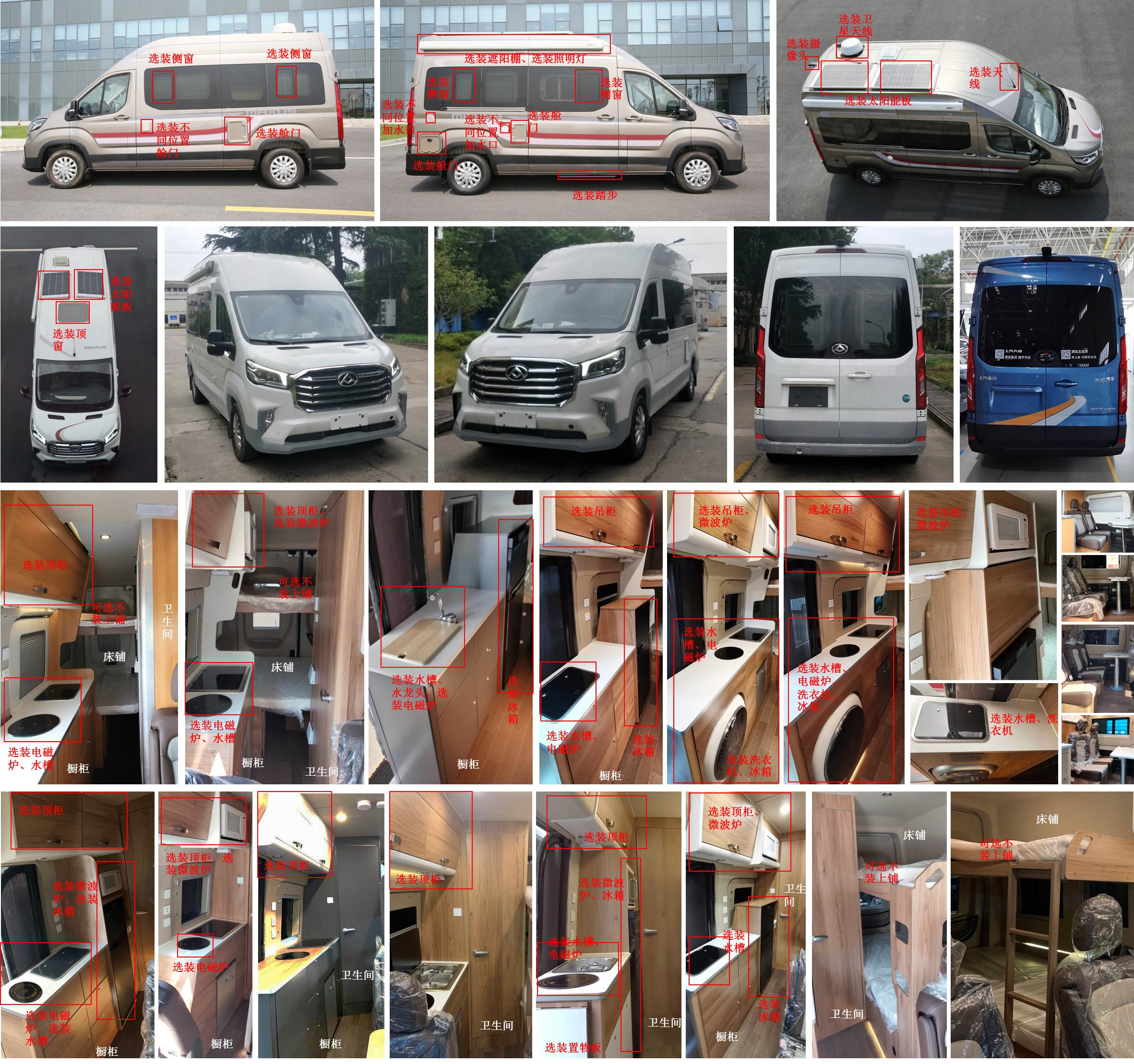 该车型配备厨具、卧具、卫生设施、供排水设施、电气设施等旅居生活设施和娱乐设施等专用装置,用于旅居宿营.车顶标配换气扇(车高2825mm),选装卫星天线(车高2957mm)、太阳能电池板、遮阳棚、流媒体摄像头、侧推拉式窗、舱门、加水口、市电口、顶窗.随原车选装散热器格栅、前大灯、日间行车灯、后尾灯、轮圈、轮饰盖、尾门标识、移门侧踏步、同平面推拉窗、固定粘结式窗、后门开启限制.随原车可不装前雾灯、后摄像头.该车型可选装ETC车载装置.ABS生产企业:博世汽车部件(苏州)有限公司,博世汽车部件(苏州)有限公司,ABS型号:ABS 9,ESP9。发动机最大净功率:108.5kW. |
