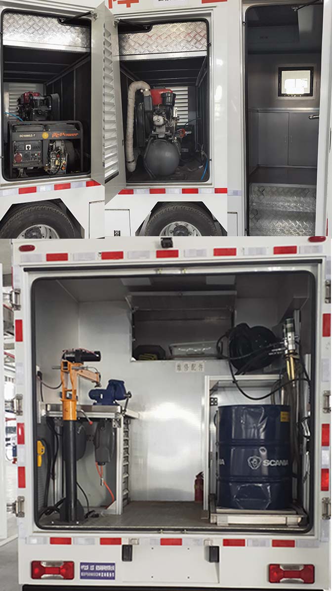 ABS型号:0 265 242 ***,厂家:BOSCH;该车主要用于提供车辆维修等应急服务;主要专用装置为发电机组,空压机组,辅助提升装置(可选装),维修工具(可选装)等组成.车厢顶部封闭且不可开启;侧后防护情况:侧防护为裙边结构,,侧防护材质为Q345,后防护材质为Q345,断面尺寸115×90mm离地高度380mm,与车辆连接方式:螺栓连接;侧面选装遮阳蓬。前悬架型式为扭力杆. |