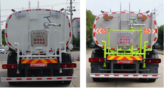 专用功能及装置:用于园林绿化,护栏清洗作业,专用装置主要是罐体和护栏清洗装置;罐体有效容积15.6立方米、罐体外形尺寸(长×长轴×短轴)(mm):6000×2350×1550.外形长(mm)/前悬(mm)/后悬(mm)/前伸(mm)对应关系为:10880/1430/2175/1280,11330/1430/2625/1280.侧防护材料为Q235,连接方式为螺栓连接支架固焊在副车架大梁上.后防护材料为Q235,连接方式:用结构连接件固焊在主车后端,后部防护装置断面尺寸(宽×高)50×140(mm),后部防护离地高度:500(mm);选装后部结构.安装带卫星定位功能的行驶记录仪;ABS型号/生产厂家:3631010-C2000/东科克诺尔商用车制动系统(十堰)有限公司. |