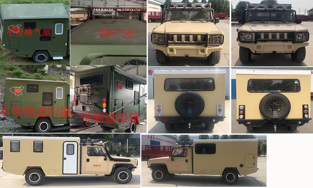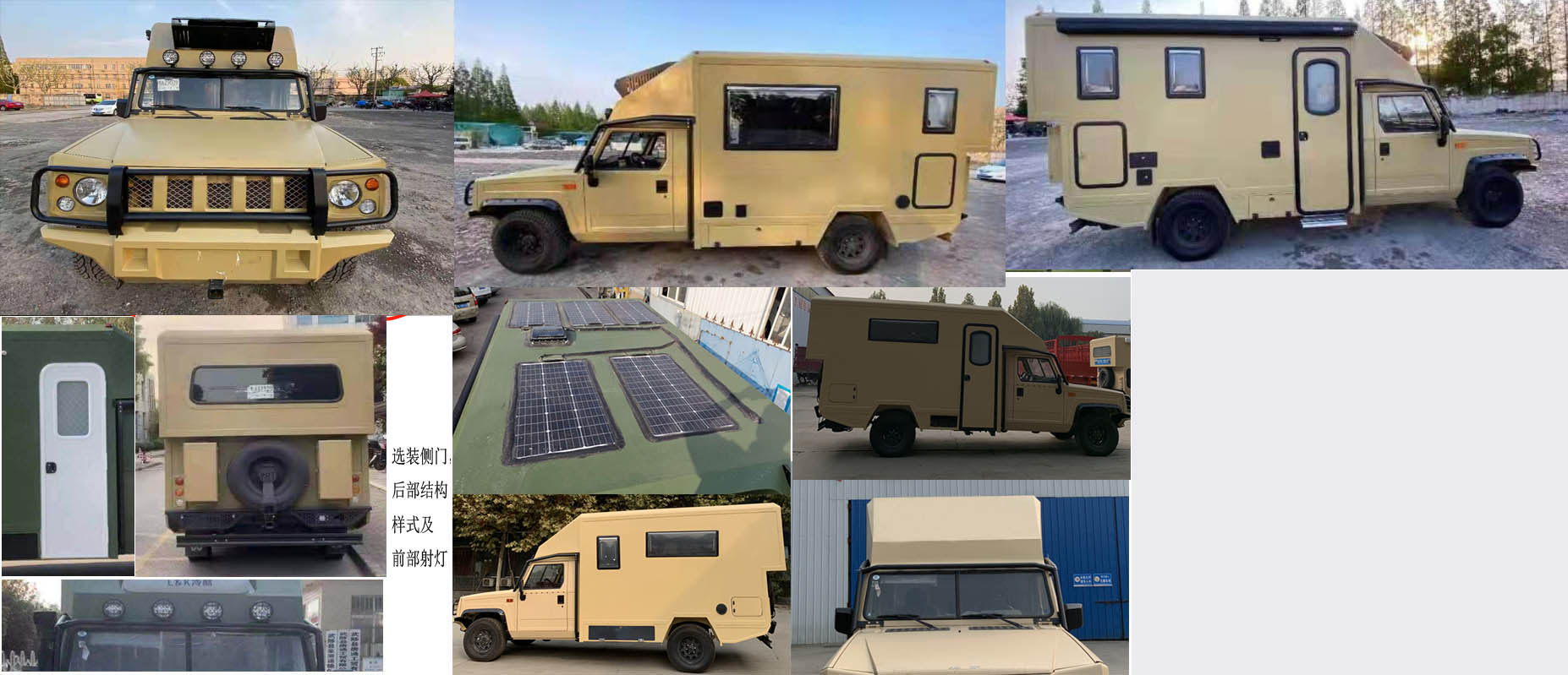 整车装配桌椅、卧具、厨具、卫生间、电视等旅居专用装置;车顶选装换气扇;侧遮阳棚,选装自行车架(选装自行车架时长度为5990),顶部选装太阳能板,选装前部及侧面样式.发动机YCY24140-60A最大净功率为99KW.ABS型号:BQ -ABS-4A,生产厂家:北京汽车(黄骅)零部件有限公司,侧边防护采用裙板式结构,后部防护材质为Q235,与车身螺栓连接,下边缘离地高度490mm,尺寸(mm):120x40. |
