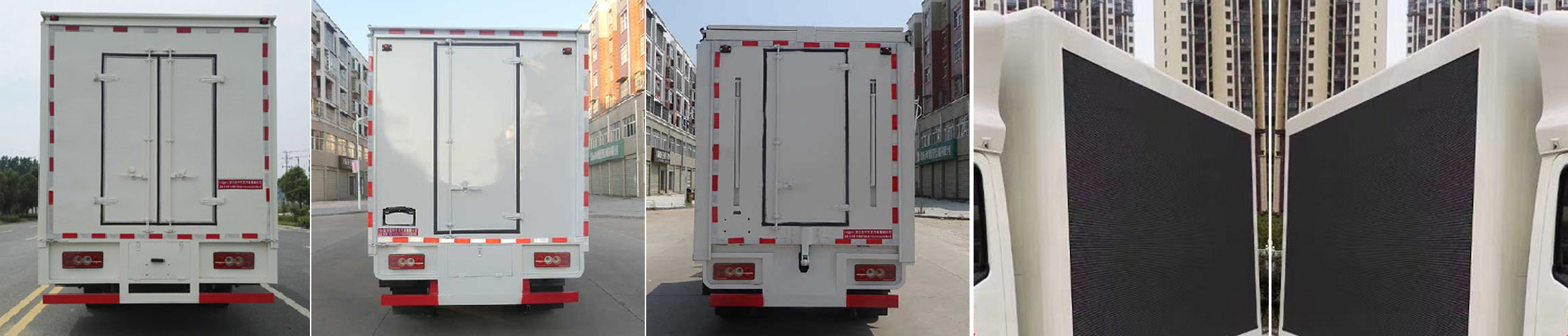 车厢顶部封闭不可开启。随底盘选装驾驶室、尿素罐样式、铝合金轮圈和油箱风格,选装后门样式,选装侧面安装LED屏幕。车厢顶棚封闭,并采用衍架结构,可升降,车厢两侧板可展开,与顶棚形成整车舞台顶棚;舞台板可折叠于车厢内,通过展开装置展后与固定舞台台面形成整车舞台台面;底盘大梁部分设有支撑装置。ABS系统控制器型号为CM4XL-4S/4M,ABS系统控制器生产企业为广州瑞立科密汽车电子股份有限公司。侧防护采用冷弯型钢/Q235-B,螺栓连接,后防护采用冷弯型钢/Q235-B,焊接连接,截面尺寸(宽×高)(mm):50×100,离地高500mm。该车主要用于移动演出活动,主要专用装置为舞台厢。 |