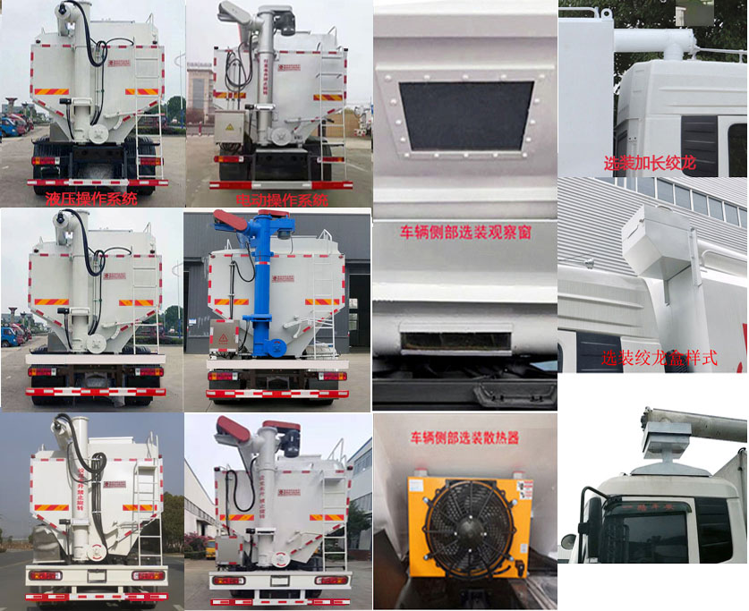 这款车外观尺寸为11500,12000×2500,2550×3750,3995(mm),总质量为31000(kg),额定质量为18270,18205,17590,17525(kg),整备质量为12600,13280(kg),上装部分就由箱体、爬梯、蛟龙以及蛟龙电机等部件组成,箱体的顶部可选装多个进料口,与此同时车辆就可以同时运输多种饲料,提高整车的运输效率,进料口的设计和制作保证箱体免受雨水的侵蚀。
