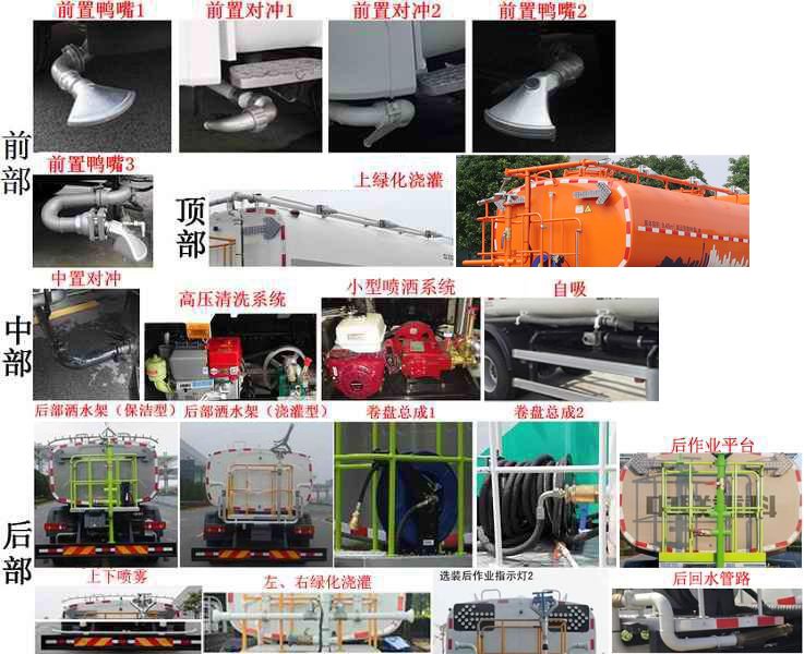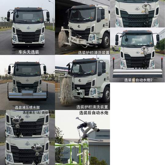 该车选用4500mm底盘轴距;该车装有水罐、水路系统、清洗工作装置、作业平台、控制系统,用于清洗作业;罐体外形尺寸(长轴×短轴×长度)(mm):2400×1420×3920.罐体有效容积9.45立方米;该车型工作装置有4种配置:A(基本型,车头无选装)、B(装液压喷水架)、C(装气控喷水架)、D(装护栏清洗装置);配置A时,整车长8090mm,接近角为12°;配置B时,整车长9050mm,前伸960mm,接近角为10°;配置C时,整车长9010mm,前伸920mm,接近角为10°;配置D时,整车长8990mm,前伸900mm,接近角为12°.侧面防护装置材料为铝合金,连接方式为螺栓连接,可选装其外观;后防护装置材料为Q345A,与车辆连接方式为螺栓连接;后部防护装置的断面尺寸为240×65mm,离地高度为490mm;该车可选装前左(右)自动水炮、前自动水炮2、后自动水炮、鸭嘴、上绿化浇灌、对冲、高压清洗系统、小型喷洒系统、自吸、后部洒水架保洁型、后部洒水架浇灌型、卷盘、后作业平台、上下喷雾、左(右)绿化浇灌、后作业指示灯2、后回水管路、整车附件局部外观,该系列选装对于整车尺寸、重量变化可忽略不计;随底盘装有ABS,ABS型号/企业:ABS-E 4S/4M/威伯科汽车控制系统(中国)有限公司. |