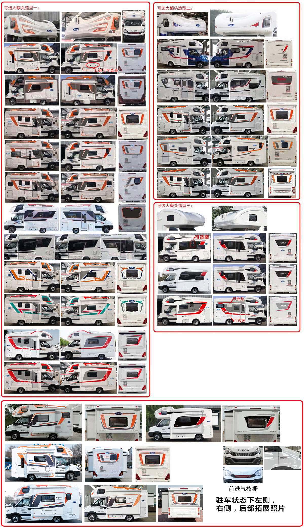 该车侧面和后部结构为裙边结构,后部结构离地高度为410mm.选装顶置空调、太阳能板、遮阳蓬、遮雨蓬、卫星天线等;选装厚款顶置空调时整车高度3180mm,无顶置空调和薄款顶置空调时车高3135mm,选装遮阳蓬时宽度2470mm,选装遮雨蓬时宽度2505mm,无遮雨蓬和遮阳蓬时宽度2375mm;同时选装遮雨蓬和遮阳蓬时宽度2545mm;选装低端配置时整车整备质量3820kg,对应额定载客(人)4、5、6;选装高端配置时整车整备质量4080kg,对应额定载客(人)4、5、6; 选装大容量电池等特殊配置时整备质量4150kg仅对应额定载客(人)4.ABS系统控制器型号:BOSCH ABS9、BOSCH ESP9, ABS系统控制器生产企业:BOSCH公司;该车专用装置由睡具、炊事设施、卫生设施、座椅等组成,是用于旅居的专用车辆.该车型可选装ETC车载装置,在驻车状态下,车辆可实现后部和侧面拓展,以扩大内部空间 |