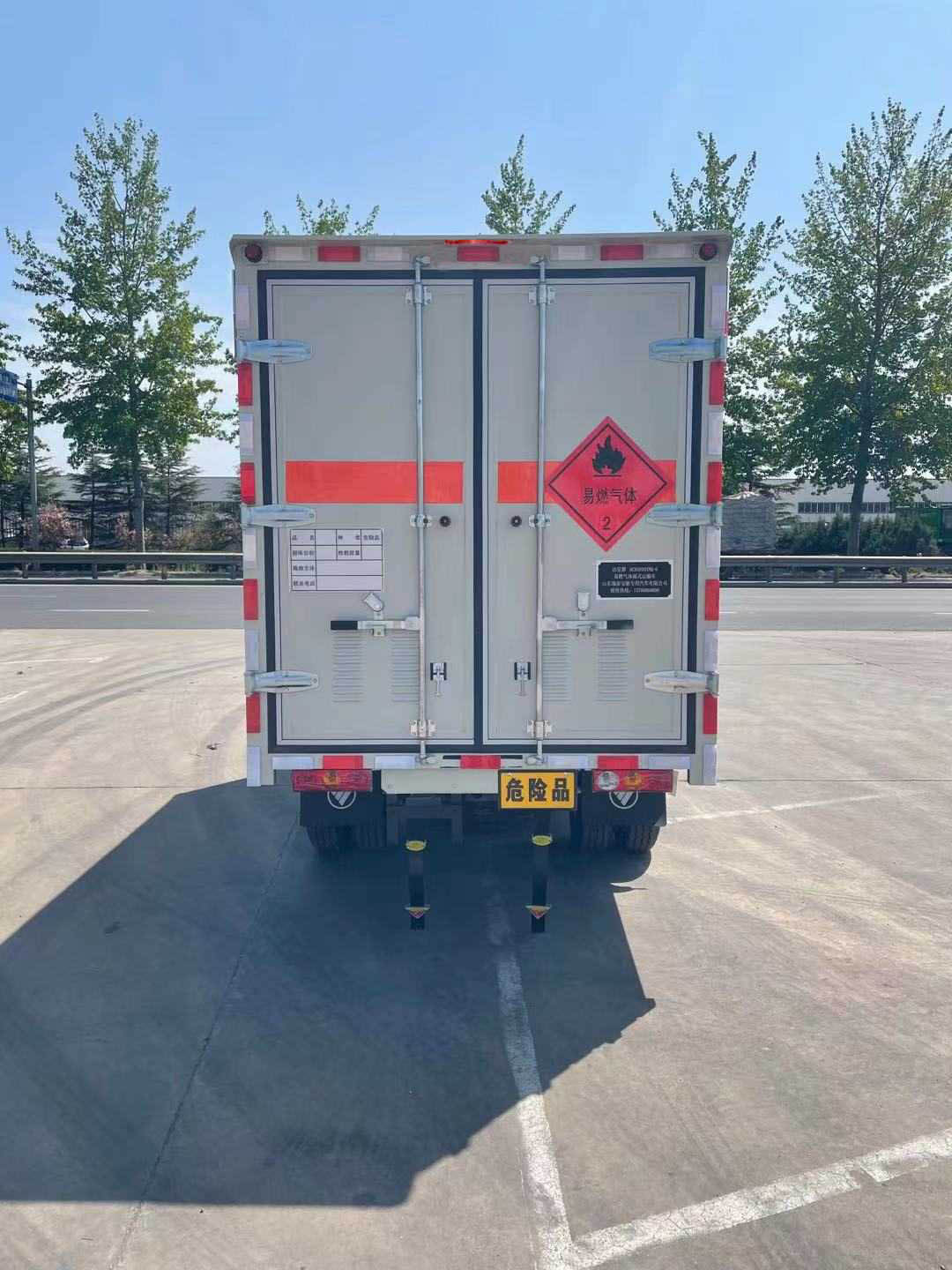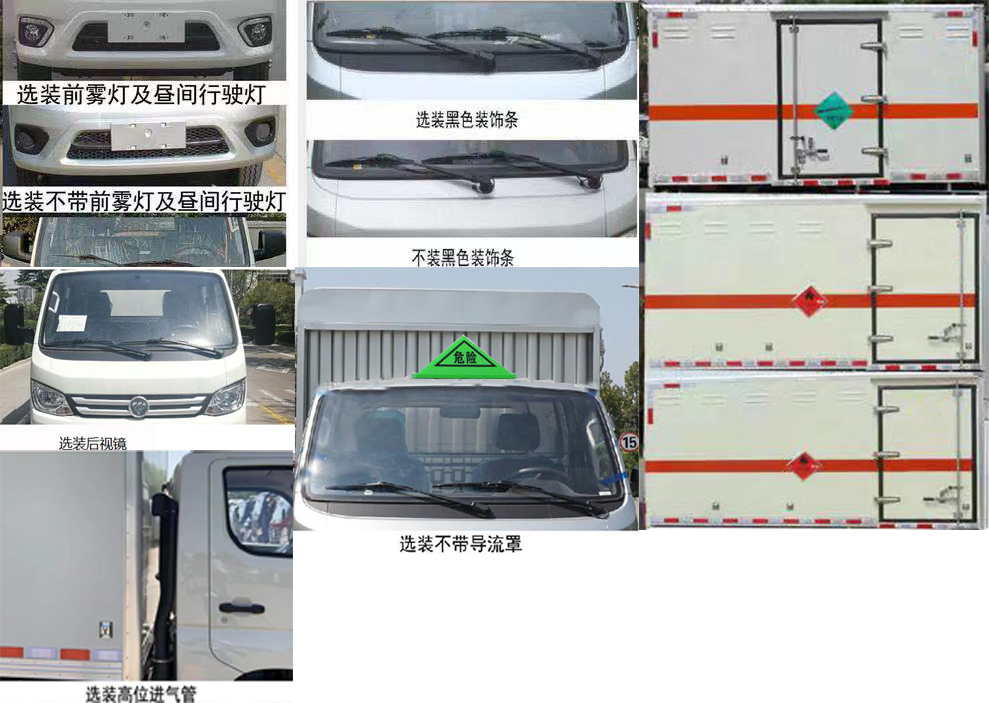备注 | 厢体顶部封闭,不可开启;厢体可选装无侧门;选装多种形式的侧开门;选装不燃气体标志牌;;车身侧面及后部粘贴橙色反光标识和易燃气体菱形标示;随底盘选装带前雾灯及昼间行驶灯造型,选装不带前雾灯及昼间行驶灯造型,可选装黑色装饰条,可选装不带黑色装饰条,选装后视镜风格;该车为危险货物运输车;在车体后部设置安全标示;运输具有独立容器(瓶)包装的易燃气体[液化石油气(罐装)、压缩甲烷或甲烷含量高的压缩天然气,乙炔,乙烷,丁 烷,丁烯,丙烯,二甲醚,压缩氢]和非易燃无毒气体(二氧化碳、氧气、氮气、压缩氧(氮,空气,氦,氩,氖),运送危险品类项号:2.1;2.2;该车安装具有卫星定位功能的行驶记录仪;ABS系统控制方式是双参数控制,ABS系统控制器型号是YF9,ABS系统控制器生产企业是武汉元丰汽车电控系统有限公司;仅用子午线轮胎,仅用底盘限速装置及前盘制动;仅选用底盘的前置排气管结构;仅用底盘限速装置,限制最高车速80km/h,发动机DAM15KL最大净功率为80kW,油耗对应关系:DAM15KL(8.3);发动机DAM16KL最大净功率为85kW,油耗对应关系:DAM16KL(8.7)该车型可选装ETC车载装置. |