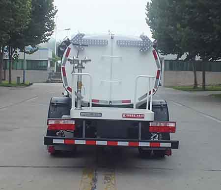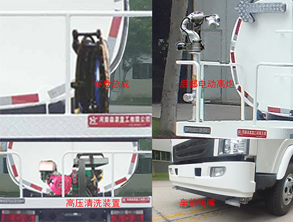 该车主要用于道路清洗,用于城市环卫作业;主要专用装置:罐体装置.介质名称:水,介质密度:1000千克/立方米,罐体有效容积:4.25立方米,罐体外形尺寸(长度×长轴×短轴): 3550×1600×1100(mm).该车仅选用3308mm轴距.仅选用CY4SK361发动机,对应的净功率:122kW.侧防护和后防护材料材质为Q345B,连接方式为螺栓连接;后防护截面尺寸为110×50(mm),离地高度为385mm.ABS型号为CM4XL-4S/4M,生产厂家为广州瑞立科密汽车电子股份有限公司.选装前鸭嘴、卷盘、高压清洗系统、后电动高炮等装置. |