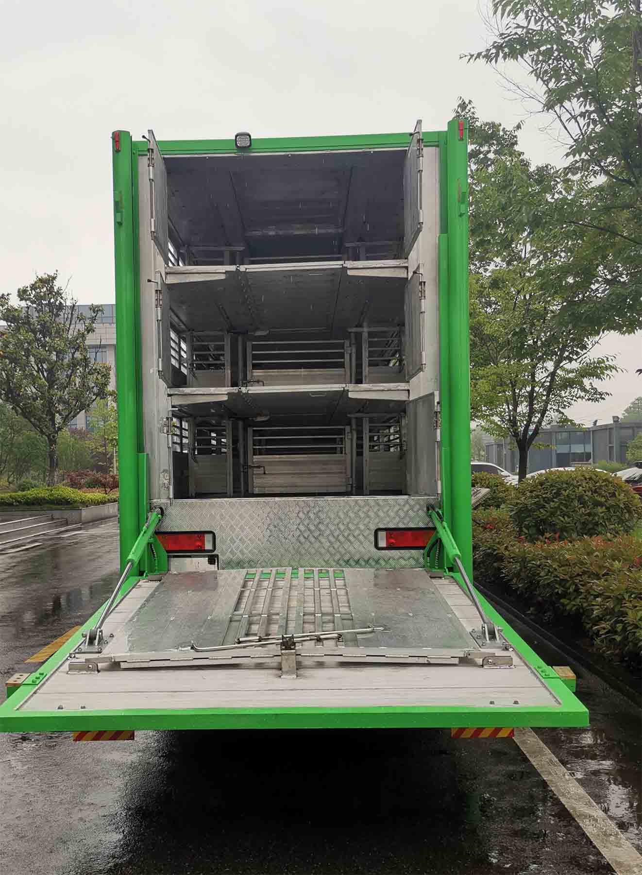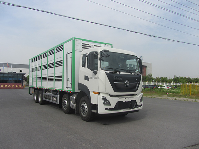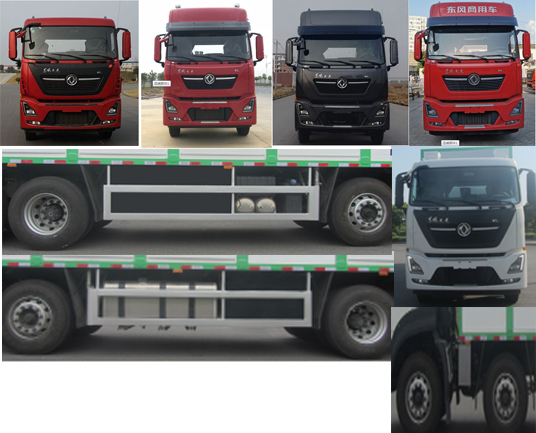备注 | 1.随底盘选装仅高度不同的驾驶室,高顶驾驶室顶部气喇叭为选装件,驾驶室前角扰流板为选装件,选装驾驶室前面罩,选装驾驶室顶部"东风商用车"企业标识;2.选装双油箱和容积不同的单油箱;后处理选装不同外形结构;选装驻车空调电瓶;3.车厢顶部翻板门及过道翻板,中间有隔栏,侧面有滑窗及风扇,选装两层、四层厢体结构,选装无制冷空调,选装储水箱(仅用于畜禽饮水及喷雾降温),选装无工作舱,侧边无单开门车厢,选装车厢左侧前工具舱;4.箱体中间有隔板,货箱底板到仓栅顶部的高度为2520、2550、2580;5.后部轻质液压尾板收起时水平长度为300mm,尾板总质量为550kg;6.该车安装具有卫星定位功能的行驶记录仪;7.ABS型号/生产企业:ABS8/东科克诺尔商用车制动系统(十堰)有限公司;8.发动机L9NS6B360、L9NS6B400、DDi11E385-60、DDi11E430-60、DDi11E465-60的净功率分别为264kW、288kW、289kW、318kW、337kW,所对应的油耗值分别为36.9L/km、36.9L/km、37.2L/km、37.2L/km、37.2L/km;9.轴距-后悬对应关系:1995+4400+1350-2675,1995+4600+1350-2475,2050+4400+1350-2620,2050+4600+1350-2420;10.侧面防护装置采用铝合金材质焊接而成,材料6061-T6,通过螺栓连接方式与底板相连,后防护为裙边结构,下横梁断面尺寸(高×宽mm):120×60,材料Q235A,离地高度480mm,通过焊接方式和车架相连;11.选装限速装置,限速89km/h;12.专用功能及装置:该车专用装置为厢体和液压尾板,主要用于牲畜的运输;13.选装ETC车载装置. |