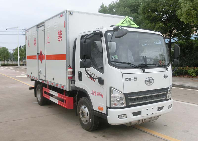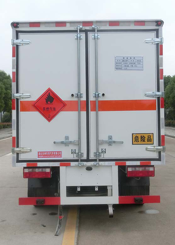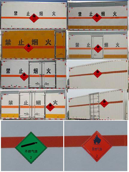 备注 | 仅选用底盘3300轴距.该车为危险货物运输车辆.随底盘选装驾驶室;车厢顶部封闭,不可开启,厢体两侧选装不同形式侧开门及开门位置或不带侧门,选装开百叶窗,选装瓦楞板结构.该车运输具有独立容器包装的易燃气体:液化石油气,压缩天然气,乙炔,乙烷,丙烷,丁烷,异丁烷,丁烯,甲烷,丙烯,环丁烷,丙二烯,甲乙醚,打火机或打火机加油器(装有易燃气体),氢,运送危险品类项号为2.1;运输具有独立容器(瓶)包装的非易燃无毒气体:液化气体(非易燃,充有氮,二氧化碳或空气),压缩氧(氮,空气,氦,氩,氖),二氧化碳,类项号2.2。侧/后防护材料为Q235,侧防护连接方式:螺栓连接,后防护连接方式:焊接连接,后防护截面尺寸(mm):100×50,离地高度400mm。该车仅使用排气管前置、前轮为盘式制动器、装配子午线轮胎的底盘,转向轮安装轮胎爆胎应急防护装置,安装导静电带;该车装有ABS,ABS防抱死制动系统生产厂家/型号:广州瑞立科密汽车电子股份有限公司/CM4XL-4S/4M;浙江万安科技股份有限公司/VIE ABS-II;该车安装具有卫星定位功能的行驶记录仪,该车装配有限速装置,限速80km/h。发动机型号对应油耗申报值(L/100km):WP2.3NQ120E61/11.41,WP2.3NQ130E61/11.41,H20-120E60/10.09,CA4DB1-13E6/10.04.该车可选装直接供电式ETC车载装置. |