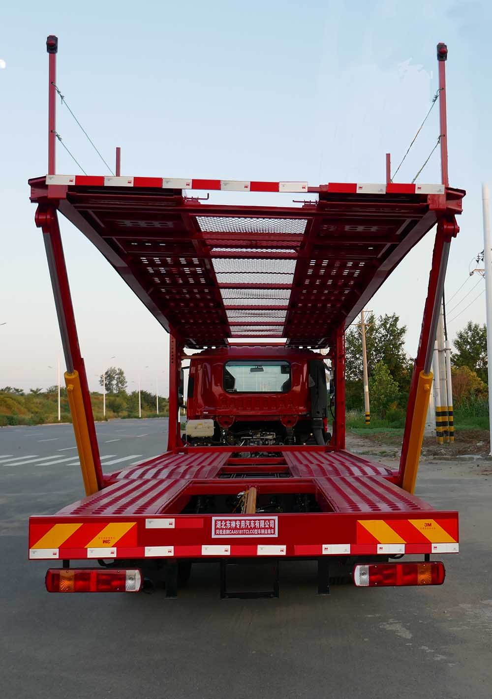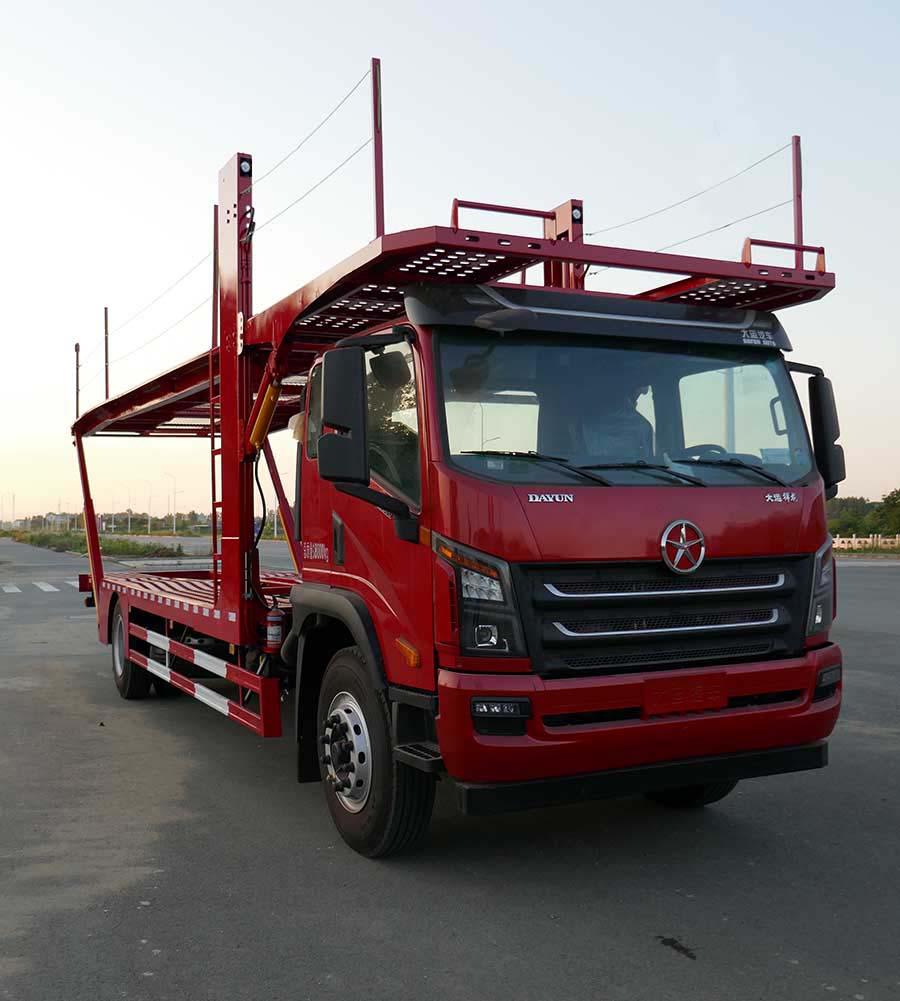 同锐通牌大运祥龙国六五位板车辆运输车轿运车外观时尚,设计更加科学,外形尺寸为10140×2550×3950,3830,3700(mm),整车的上户吨位为9555,9255,8905(kg),总质量为18000(kg),上装的上层板和下层板之间的距离可以调整,以适应装载不同的车型;低合金高强度钢的上装材质的使用,让整车的质量更轻,承载力更强;采用进口的液压系统,操作简单,安全性大大提高。
