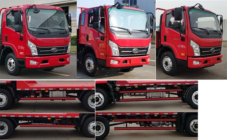 整车的外形尺寸为6720,6920,7150,7380,7570,7770×2400,2500,2550×2830,2900,2950,3030,3150(mm),外观造型简约大气,整车的上户吨位为6200,5750(kg),总质量为11995(kg),上装平板采用板材厚度适中的花纹板,凹凸设计,防滑美观,承载也强。