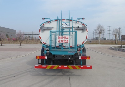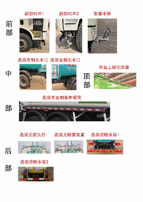 ①仅选用4350+1350mm轴距底盘。②罐体外形尺寸(长轴×短轴×长度)(mm):2400×1410×6100.罐体有效容积15.0立方米.介质名称:水,介质密度:1000千克/立方米。③侧面防护装置材料为铝合金,与车辆的连接方式均为螺栓连接。后下部防护装置材料为Q235钢板,与车辆的连接方式为焊接连接;后下部防护断面尺寸为140mm×50mm,下边缘离地高度为460mm。④该车选装智能水枪时,前伸为560mm,对应整车长度为10100mm,该系选装对于整车重量变化可忽略不计;⑤该车可选装前对冲、罐体尾部左右侧无水口、顶部上绿化浇灌、备件管筒、无箭头灯、无上喷雾、后部洒水架等,该系选装对于整车尺寸,重量变化可忽略不计;⑥ABS型号为:CM4XL,生产厂家为长春瑞立科密汽车电子有限公司;⑦该车主要专用装置为罐体、洒水炮、水路系统,用于道路清洗作业。 |