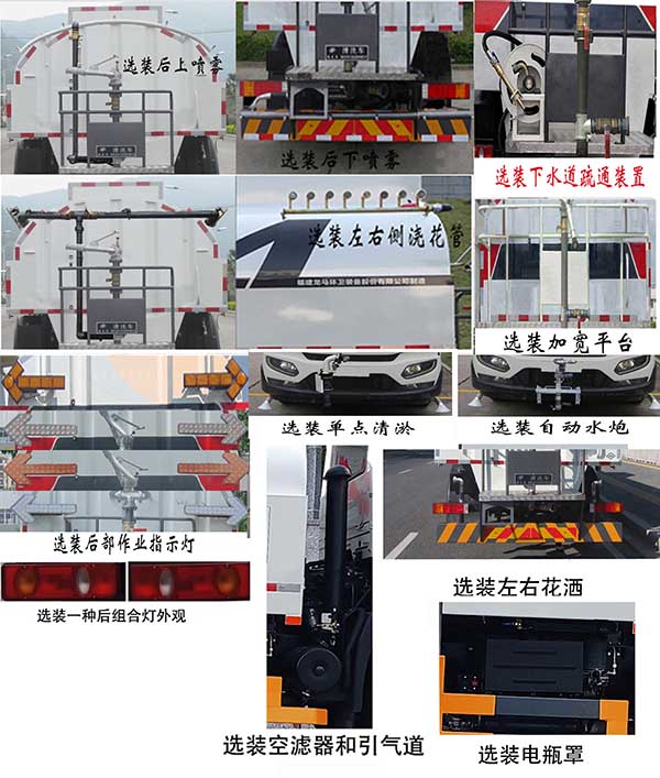 仅选用4500mm轴距;罐体外形长轴×短轴×长度(mm):2300×1350×4300,罐体有效容积:9.52立方米;介质名称为:水;介质密度:1000千克/立方米;该车有3种配置:A(标配)、B(选装自动水炮) 、C(选装单点清淤)。 各配置整车长度(mm)/前悬(mm)对应关系如下: 配置A:8300/1400; 配置B: 8750/1850; 配置C: 9070/2170; 当选装另一种驾驶室外观时整车高度为:2920mm,其中配置A长度(mm)/前悬(mm)为8330/1430;侧防护及后部防护装置的材料材质:Q235B;连接方式均为螺栓连接;后部防护装置的断面尺寸(宽×高)mm:60×230;后部防护装置的离地高度480mm;随底盘驾驶室选装:侧窗.前雾灯。遮阳罩.前格栅造型及灯具;可选装:1、后上喷雾;2、后下喷雾装置; 3、加宽平台;4、下水道疏通装置;5、左右侧浇花管; 6、后部作业指示灯;7、左右花洒;8、电瓶罩;9、空滤器和引气道;10、一种后组合灯外观。以上10种选装配置引起的重量及整车尺寸变化可以忽略不计。该车装备有罐体,水泵,管道系统等,用于清洗路面,对路面喷洒水降尘等作用。ABS型号/生产厂家:3631010-C2000/东科克诺尔商用车制动系统(十堰)有限公司,ABS-E 4S/4M/生产厂为威伯科汽车控制系统(中国)有限公司。 |