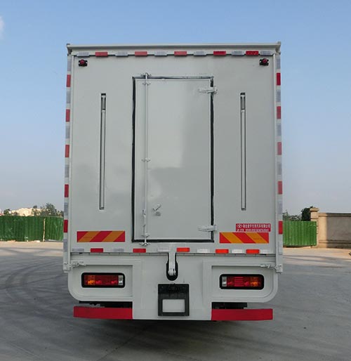 选装后门样式。车厢顶棚封闭,并采用衍架结构,可升降,车厢两侧板可展开,与顶棚形成整车舞台顶棚;舞台板可折叠于车厢内,通过展开装置展后与固定舞台台面形成整车舞台台面;底盘大梁部分设有支撑装置。ABS系统生产厂家:西安正昌电子股份有限公司,型号:ZQFB-V。侧防护采用冷弯型钢/Q235-B,螺栓连接,后防护采用冷弯型钢/Q235-B,螺栓连接,截面尺寸(宽×高)(mm):50×120,离地高500mm。该车主要用于移动演出活动,主要专用装置为舞台厢。 |