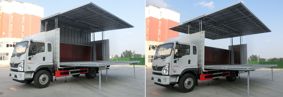 整车舞台展开方式有单展/双展/三展可选,全自动液压系统操作,省时省力。随车配有舞台梯、灯光挂架、幕布挂钩及电源箱。可选装空调、音响平台、LED显示屏等。