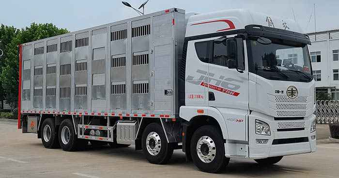 畜禽运输车又被叫做运猪车、拉猪车、鸡苗运输车,是一种主要用来运输活禽类的专用车型,有仓栅式和厢式两种结构形式,前一种结构比较简单,适合短途运输,而后一种配置上比较高端,适合活禽的长途运输,能够最大程度的保证活禽成活率,提高运输效率,那接下来就给大家介绍一款优质的畜禽车,即大力牌解放JH6前四后八国六铝合金畜禽运输车畜禽运输车,这款畜禽运输车有着怎样的配置呢?
