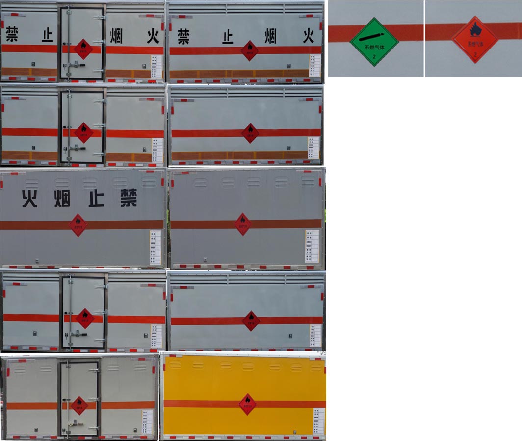 备注 | 选装驾驶室,选装侧门,选装侧面不开门,选装百叶窗,选装不燃气体标识牌;该车用于危险品运输,厢体顶部封闭,不可开启;用于运输具有独立容器(瓶)包装的易燃气体,介质:液化石油气,压缩甲烷或甲烷含量高的压缩天然气,乙炔,乙烷,丁烷,丁烯,丙烯,二甲醚,压缩氢,类项号为2.1;运输具有独立容器(瓶)包装的非易燃无毒气体:二氧化碳,压缩氧(氮,空气,氦,氩,氖),类项号为2.2; 该车仅使用排气管前置,前轮为盘式制动器底盘,仅使用子午线轮胎;ABS系统型号:APG3550500A,ABS系统生产厂家:浙江亚太机电股份有限公司;该车安装具有卫星定位功能的行驶记录仪,该车装配有限速装置,限速80km/h;侧防护、后防护与车辆均采用螺栓连接,材料均为:Q235,后防护断面尺寸(mm):100×50, 离地高度430mm; 发动机JX4D30B6H和JX4D30A6H油耗值均为11.3L/100km.转向轮安装轮胎爆胎应急防护装置 |