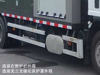 该车选用4175mm底盘轴距;该车装有清水箱、水路系统、疏通水管卷盘、电气控制系统,用于下水管道的疏通、清洗和维护作业;罐体外形尺寸(直径×长度)(mm):1350×2850.罐体有效容积3.9立方米.该车选装尾部卷盘时的整车长为7275mm,对应后悬1990mm,其与参数与标配一致.侧防护装置材料为铝合金,连接方式为螺栓连接,可选装其右侧局部外观;后防护装置材料为Q355B,与车辆连接方式为螺栓连接;后部防护装置的断面尺寸为180×65mm,离地高度为390mm;随底盘装有ABS,ABS及控制器型号为:APG3550500H1,生产厂家为:浙江亚太机电股份有限公司.可选装无三元催化保护罩外观、整车标识涂装、侧防护logo等. |