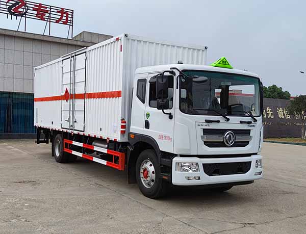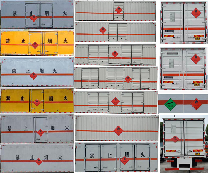 备注 | 1、该车为危险品货物运输车,该车运输独立容器(瓶)包装的货物,危险物品类项号:2.1,2.2,运输易燃气体时挂2.1类警示牌,运输非易燃无毒气体时挂2.2类警示牌;厢体顶部封闭,不可开启。2、侧防护材料为Q235,采用螺栓连接;后防护材料Q235,焊接连接,后防护截面尺寸(mm):120×40,下边缘离地高430mm;液压尾板收起状态的水平长度为300mm,尾板质量为550kg。3、整车长/轴距/货厢长对应关系为:9950/5600/7680,9120/5300/6850,8570/4700/6300;安装限速装置,限速80km/h;仅采用排气管前置,前轮盘式制动器,子午线轮胎的底盘;后轴为空气悬架,转向轮安装轮胎爆胎应急防护装置,该车安装带有卫星定位功能的行驶记录仪;可选装ETC车载装置;EBS系统生产厂家,型号:襄阳东风隆诚机械有限责任公司,EBS/ESC-d;发动机/油耗值对应关系(L/100km):B6.2NS6B210/26.3,CY4SK761/26.8,D4.0NS6B195/26.6,D4.5NS6B220/26.6,YCS04200-68/26.4。4、选装不带液压尾板(不带液压尾板时后防护材料Q235,焊接连接,截面尺寸120×40mm,下边缘离地高度430mm);选装侧开门,侧门单开门、侧门双开门、侧门不开门,选装侧门型式及位置,选装瓦楞板,选装后门样式。 |
