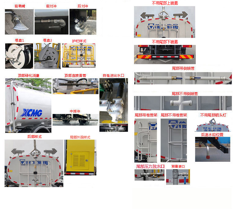 该车主要专用装置为水罐、水路及作业装置,用于路面环境清洗清洁作业.前伸尺寸980mm.罐体的有效容积:10.4立方米,罐体外形尺寸长轴×短轴×长度(mm):2440×1470×3795,介质为水;仅采用4500mm轴距底盘;随底盘选装驾驶室;选装鸭嘴、对冲、卷盘、顶部绿化浇灌、直喷雾管、中排冲、自吸进出水口、后部样式、局部外观样式、尾部上下喷雾、直喷管、卷管架、不带尾部箭头灯、后洒水砣位置、尾部放水口、预留接口,该系列选装对于整车尺寸、重量变化可忽略不计;侧防护与后防护装置材质均为Q355B,连接方式均为螺栓连接;后防护装置的断面尺寸为180×60mm,离地高度为485mm.ABS型号/厂家:ZQFB-V/西安正昌电子股份有限公司. |
