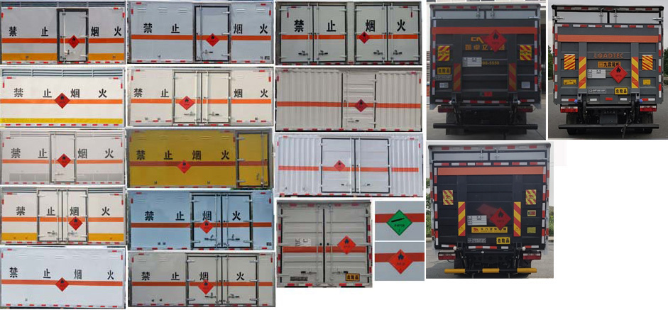 车厢顶部封闭不可开启;ABS防抱死制动系统生产厂家/型号:1.广州瑞立科密汽车电子股份有限公司/CM4XL-4S/4M;2.浙江万安科技股份有限公司/VIE ABS-II;安装有限速装置,限速装置限速(km/h):80;安装有具有卫星定位功能的行驶记录仪;随底盘选装驾驶室;选装厢体开门型式及位置;选装瓦楞板结构厢体;选装起重尾板(收起状态水平长度为280mm),尾板质量为350kg;选装不同厂家尾板以及尾板外观;该车选装ETC车载装置;发动机/油耗申报值(L/100km)对应关系为:WP2.3NQ120E61/15.2,WP2.3NQ130E61/15.2,CA4DB1-12E6/13.38,CA4DB1-13E6/13.38;侧面防护及后下部防护装置材料材质:Q235,侧面防护连接方式:焊接连接;后下部防护装置连接方式:焊接加螺栓连接,断面尺寸(宽×高):45×100(mm),离地高度:495mm;选装起重尾板时,后防护连接方式:焊接加螺栓连接;断面尺寸(直径):Φ110(mm),离地高度:460mm;运输独立容器(瓶)包装的介质类项号为:2.1,2.2;该车为危险品货物运输车;仅采用前轮盘式制动器,前置排气管,子午线轮胎;转向轮安装爆胎应急防护装置; |