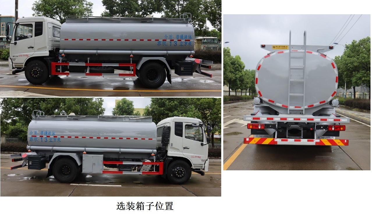 该车为普通液体运输车,罐体有效容积:13立方米;罐体外形尺寸(长×宽×高)(mm):5600×2100×1500;仅采用轴距4700mm的底盘;侧防、后防采用Q235材质,连接方式均为螺栓连接,后防护断面尺寸(mm):130×90,离地高度(mm):490;该车装有具有卫星定位装置的行驶记录仪;ABS型号/生产厂家:3631010-C2000/东科克诺尔商用车制动系统(十堰)有限公司,ABS 8/东科克诺尔商用车制动系统(十堰)有限公司,4460046450/威伯科汽车控制系统(中国)有限公司,J ABS/焦作博瑞克控制技术有限公司;发动机型号及油耗值(L/100km)的对应关系为:DDi50E220-60/25.1, D4.0NS6B185/25.2,D4.0NS6B195/25.2,B6.2NS6B210/23.8,B6.2NS6B230/23.8,D4.5NS6B190/24.4,D6.7NS6B230/23.7,DDi50E190-60/23.9;该车型可选装ETC车载装置.选装箱子位置. |