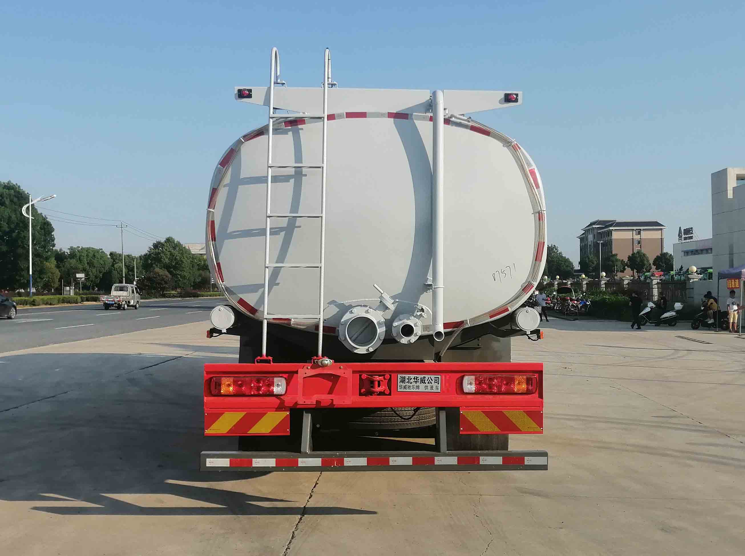 车身四周贴有反光标贴,充分保障行车安全,在罐体上还喷有易燃液体/气体的危险警示标志,警示过往车辆注意避让。