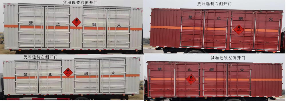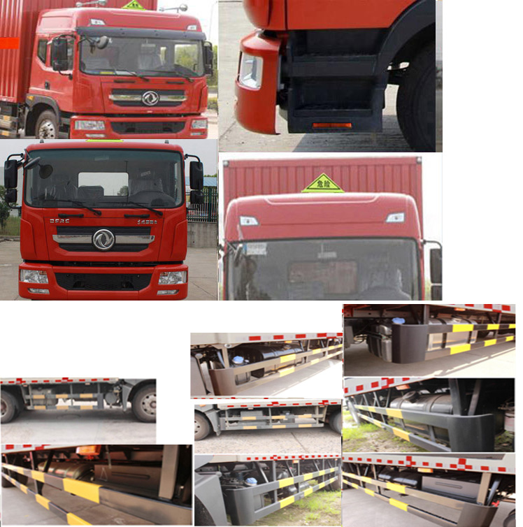 厢体顶部封闭,不可开启;随底盘选装驾驶室,选装燃油箱,电瓶,尿素罐,储气筒左右安装位置,选装侧开门,侧门可为单开门或双开门或三开门或不开门,选装侧门型式及位置,选装双门杆,选装平面和瓦楞板结构,选装货厢两侧开门;起重尾板收起状态水平长度为290mm,尾板质量为550kg(不计整备质量之内);该车为危险货物运输车,运输具有独立容器包装的易燃气体,类项号为2.1;运输具有独立容器(瓶)包装的非易燃无毒气体,类项号为2.2;仅采用前轮盘式制动器,前置排气管,子午线轮胎,限速装置的底盘,限速80km/h;后轴为空气悬架;转向轮安装爆胎应急防护装置;发动机B6.2NS6B230,D4.5NS6B220,YCS04200-68,CY4SK761油耗值均为26.6L/100km;该车安装具有卫星定位功能的行驶记录仪;EBS系统生产厂家,型号 :襄阳东风隆诚机械有限责任公司,EBS/ESC-d;侧面防护及后下部防护装置材料材质:Q235,连接方式:焊接加螺栓连接;后下部防护装置断面尺寸(宽×高):60×120(mm),离地高度:480mm.可选装不带液压尾板,不带液压尾板状态后下部防护装置断面尺寸(宽×高):60×120(mm),离地高度:480mm,连接方式:焊接加螺栓连接;可选装ETC车载装置. |