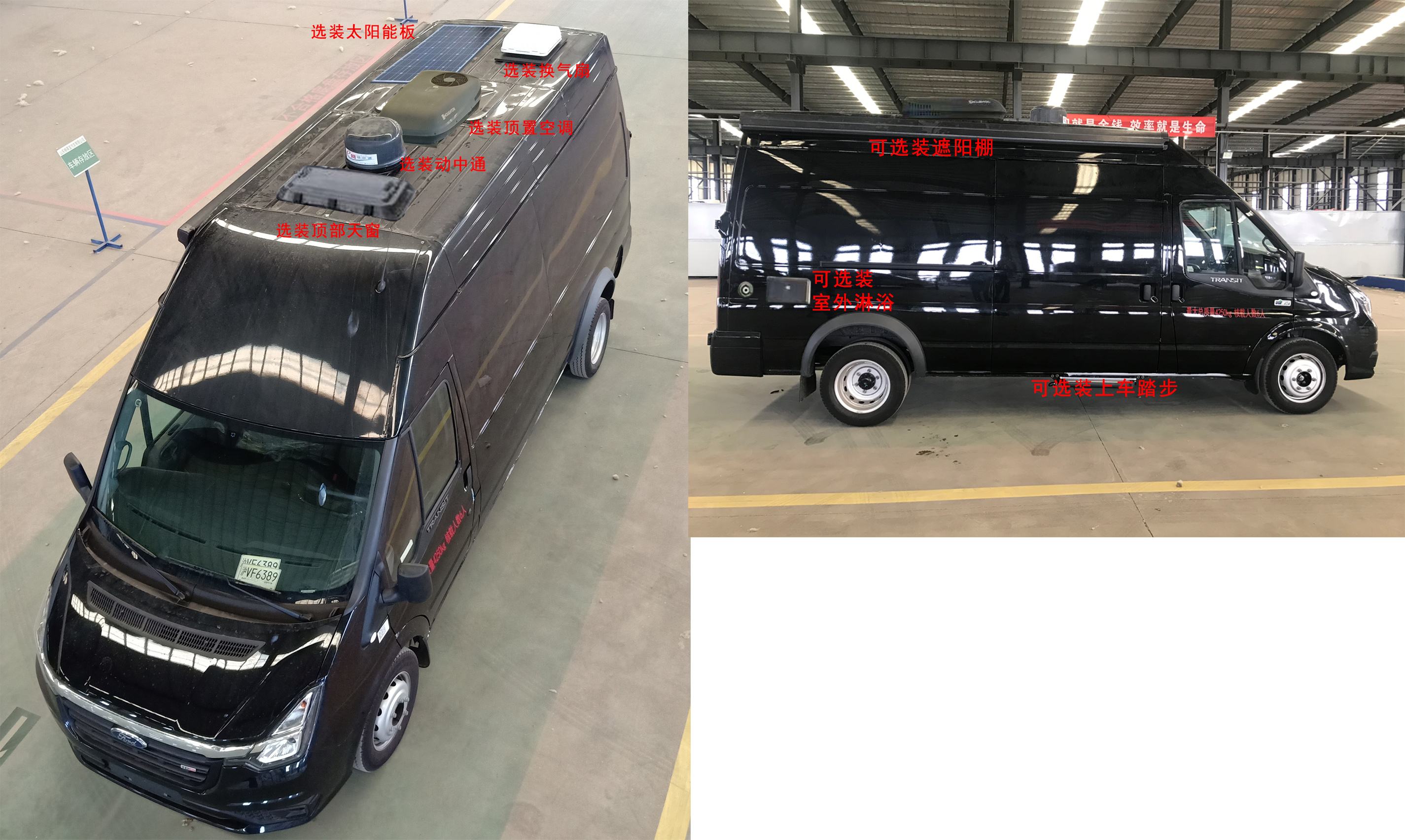 该车配备卧具、厨具、卫生设施等旅居生活设施和娱乐设施,用于旅行宿营,该车卧具可由折叠沙发床、床铺搭建支架与座椅搭建而成.选装高配时对应整备质量为3842kg,选装中配时对应整备质量为3580kg,选装简配时对应整备质量为3360kg;车辆顶部无选装配件,底盘为中顶状态时对应车高为2360mm,底盘为高顶状态时对应车高为2590mm;车辆顶部可选装太阳能板、换气扇、顶部天窗、动中通、顶置空调;车辆顶部选装太阳能板、换气扇、顶部天窗、动中通及顶置空调等不同配件时,整车高度分别为:2640mm,2690mm,2750mm,2845mm;车辆右侧可选装遮阳棚、室外淋浴、上车踏步;车内可选装电磁炉、水槽、微波炉、冰箱、卡拉OK;随底盘选装前大灯,后尾灯,轮辋,前脸造型;可选装直接供电式ETC车载装置 |