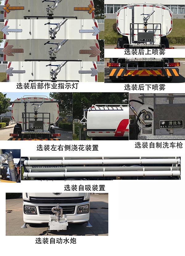 罐体外形长轴×短轴×长度(mm):2397×1448×4500,罐体有效容积:10.04立方米。该车有2种配置:A(标配)、B(选装自动水炮)。 各配置整车长度(mm)/前悬(mm)对应关系如下: 配置A:8000/1450;配置B: 8490/1940;侧防护及后部防护装置的材料材质:Q235B;连接方式为螺栓连接;后部防护装置的断面尺寸(宽×高)mm:60×230;后部防护装置的离地高度480mm。可选装:1、后上喷雾装置;2、后下喷雾装置;3、自制洗车枪;4、左右侧浇花装置;5、后部作业指示灯;6、自吸装置。以上6种选装配置引起的重量及整车尺寸变化可以忽略不计。该车装备有罐体,水泵,管道系统等,用于清洗路面,对路面喷洒水降尘等作用。ABS型号/生产厂家:ZQFB-V/西安正昌电子股份有限公司。 |