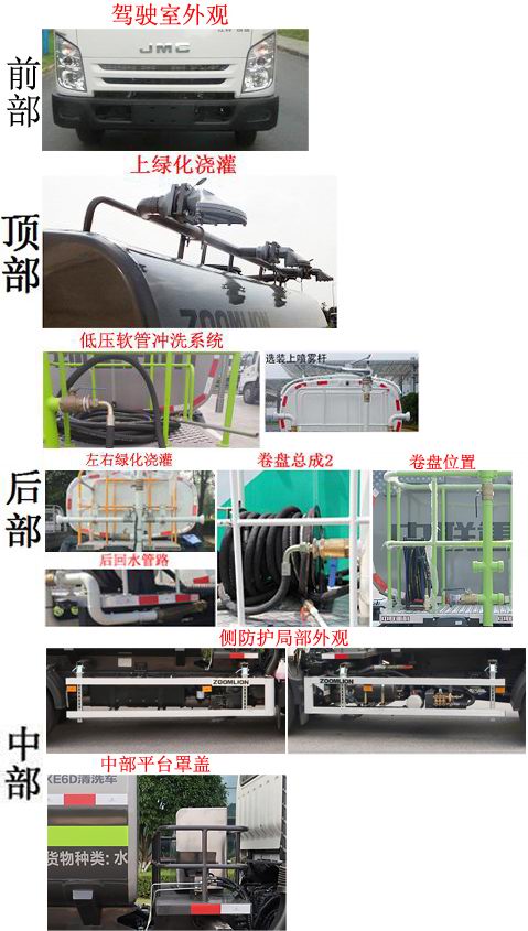 该车选用3360mm底盘轴距;该车装有水罐、水路系统、清洗工作装置、作业平台、控制系统,用于清洗作业;罐体外形尺寸(长轴×短轴×长度)(mm):1800×1105×2690.罐体有效容积3.68立方米.该车整车长7100mm,前伸840mm;侧防护装置材料为铝合金,连接方式为螺栓连接;后防护装置材料为Q345A,与车辆连接方式为螺栓连接;后部防护装置的断面尺寸为180×65mm,离地高度为435mm,该车可选装上绿化浇灌,低压软管冲洗系统,左右绿化浇灌,后回水管路,卷盘总成,卷盘位置,选装上喷雾杆;该系列选装对于整车尺寸,重量变化可忽略不计;随底盘装有ABS,ABS系统型号: VIE ABS-II,ABS系统生产厂家: 浙江万安科技股份有限公司. |