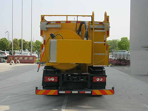 该车专用装置主要为清水罐、高压清洗泵、水路系统、疏通水管卷盘、电气控制系统,用于清洗城市下水道、管道的沉积物、死角泥沟的疏通、清洗和维护作业;罐体为对称多边形截面,罐体外形尺寸(长×宽×高)(mm):2700×2100×1400,罐体总容量:6.22立方米,有效容积:5.92立方米,运送介质品名:水;介质密度:1000千克/立方米;后防护栏的材料材质:Q235-A;侧防护的材料材质:铝合金型材;防护栏安装采用螺栓联接;后护栏截面尺寸/离地高(mm):140×140/460.ABS系统控制器型号/生产企业:ABS-E/威伯科汽车控制系统(中国)有限公司,ABS-VI·E/广州瑞立科密汽车电子股份有限公司. |