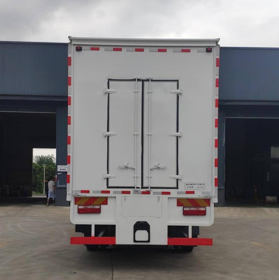 备注 | 车厢顶部封闭,并采用衍架结构,可升降,车厢两侧板可展开,与顶棚形成整车舞台顶棚;活动舞台板可折叠于车厢内,通过展开装置展开后与固定舞台台面形成整车舞台台面;底盘大梁部分设有支撑装置.该车是进行舞台文艺表演的专用车辆.侧防护采用Q235,焊接连接,后防护采用Q235,焊接连接,后防护截面高度尺寸120mm, 截面宽度尺寸55mm,下边缘离地高度450mm。ABS控制器型号/生产企业:VIE ABS-II/浙江万安科技股份有限公司,CM4XL-4S/4M/广州瑞立科密汽车电子股份有限公司.整车长/轴距/后悬对应(mm)关系为:8980/5000/2580,9980/5700/2880.选装限速装置:限速装置限速(km/h):89;该车型可选装ETC车载装置. |