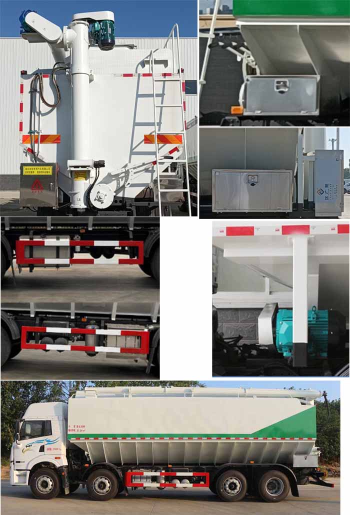 龙牧双星牌解放前四后八35.6方散装饲料运输车外型特点突出,底盘配置优越,整车的在上料,卸料过程中使用到的三个蛟龙都有自己的独到之处,三个蛟龙在工作过程中,活动蛟龙最大回转角度为180度,最大仰角为60度,同时水平输送最大距离为7.2m,垂直输送最大距离为8.2m,卸料操作的残留率为0.01.