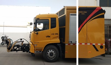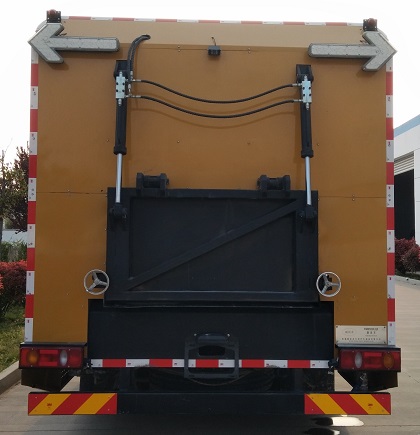 该车专用装置为高压水清除装置,主要用于城市道路交通标线的清除;仅选用4200mm轴距底盘;罐体有效容积3.55立方米,罐体外形尺寸(长×宽×高)(mm):2405X920X1980,装运介质为水,介质密度为1000千克/立方米;两种车身长度的对应关系如下:1、车头不选装前端工作装置时,前伸495mm,对应车长8605mm;2、车头选装前端工作装置时,前伸2090mm,对应车长10200mm; 防护材料:左右侧面采用螺栓连接,材质为Q235A碳钢,后下部防护采用焊接连接,材质为Q345B碳钢,后部防护断面尺寸(mm):140X60,后部防护离地高度(mm):485. ABS控制器型号/生产企业:ABS 8/东科克诺尔商用车制动系统(十堰)有限公司,4460046450/威伯科汽车控制系统(中国)有限公司,3631010-C2000/东科克诺尔商用车制动系统(十堰)有限公司; |