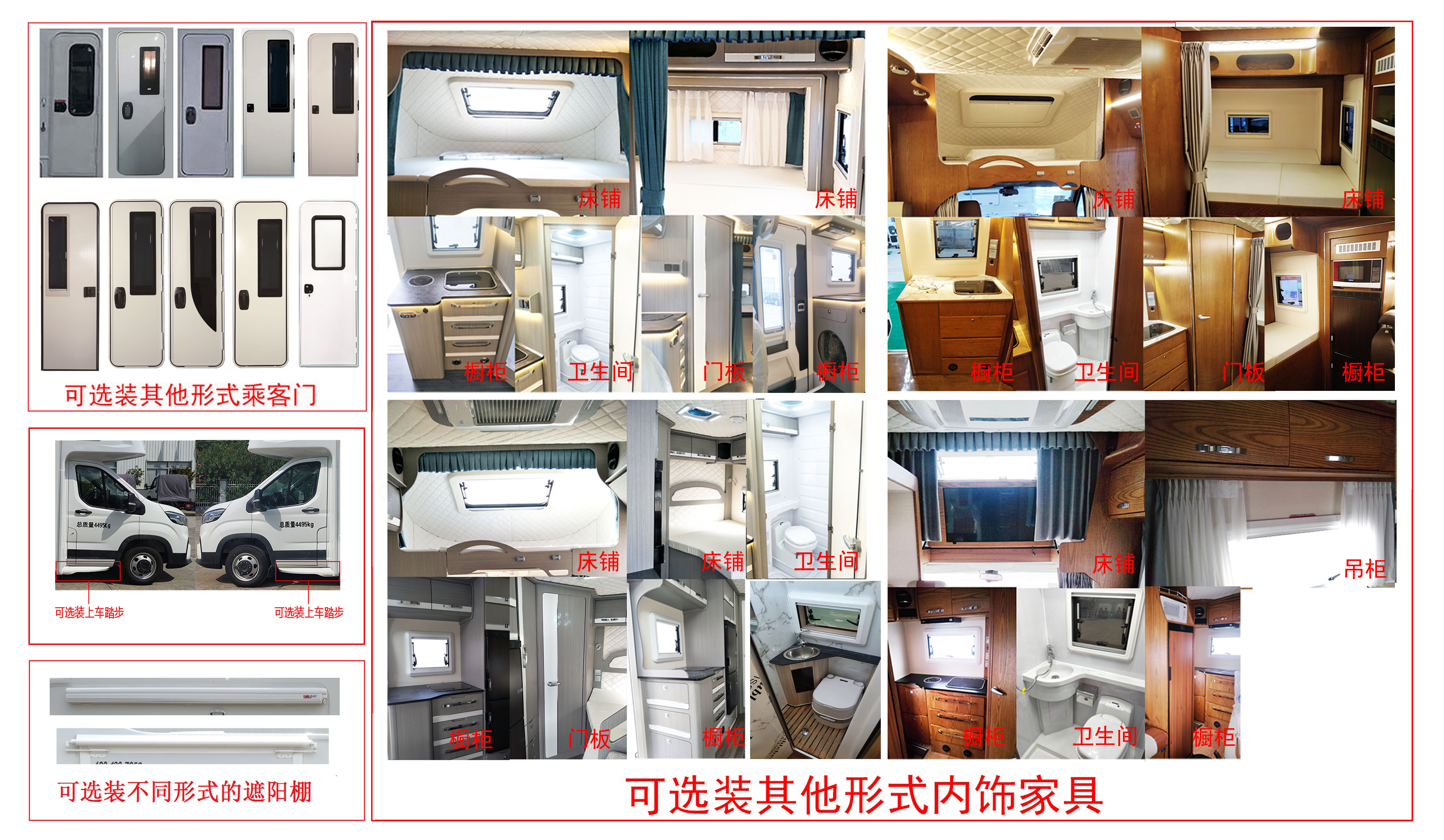 ABS型号:ABS 9,ESP9;ABS生产企业:博世汽车部件(苏州)有限公司,博世汽车部件(苏州)有限公司;发动机最大净功率值: 108.5kW;选装描述:选装不同的顶置空调或卫星天线时可引起车身高度发生变化,对应整车高度为:3000mm, 3060mm,可取消顶置空调,安装不同的天窗或顶置换气扇,对应车高为:2790mm,2850mm;不选装遮阳棚时整车宽度2330mm,选装不同的单侧遮阳篷时整车宽度为2400mm或2450mm;选装双侧遮阳篷时整车宽度为2500mm;车顶可选装天窗、卫星天线、太阳能电池,右侧可装扶手、不同型式乘客门,左右两侧均可选装遮阳篷;车身两侧或后部可选装封闭部分窗户、舱门,车身左侧可选装格栅,车身前部格栅可选装装饰条;可选装后爬梯、自行车架;可选装正副司机门上车踏步,选装不同型式乘客门,选装内部装饰布局;选装座椅;该车以裙边结构作为侧、后防护,侧防护下边缘离地高度300mm,后防护下边缘离地高度340mm;专用功能及装置:该车装备有炊事设施、床、卫生间等设备,用于旅行宿营;该车型可选装ETC车载装置 |