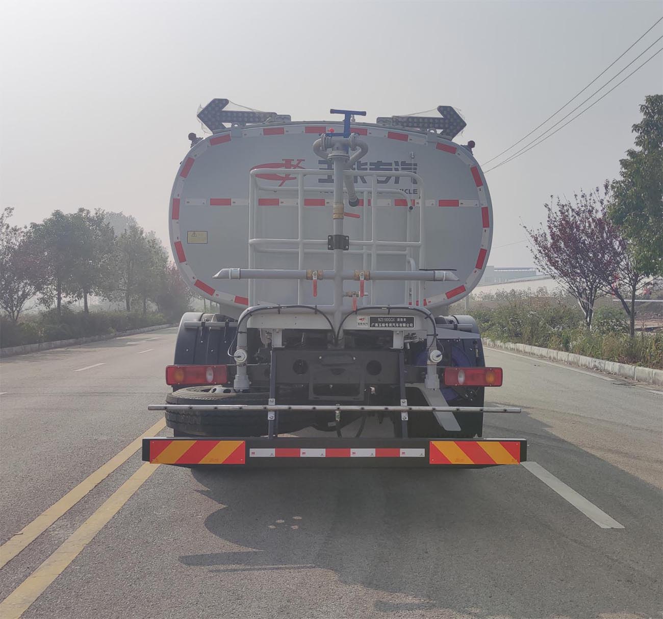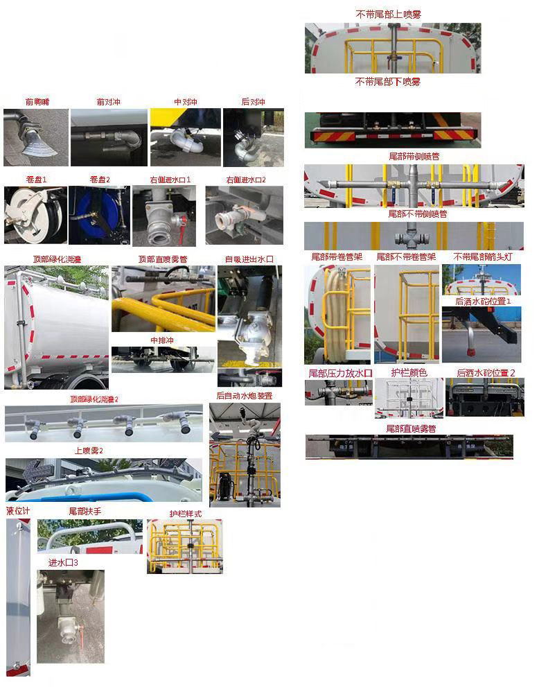 备注 | 该车主要专用装置为水罐、水路及作业装置,用于城镇环境清洗及清洁作业,仅选用4500mm轴距底盘;罐体总容量9.8立方米,罐体有效容积9.3立方米,罐体外形尺寸(长轴×短轴×长度)(mm):2440×1470×3795,装运介质为水,介质密度为1000Kg/m3;选装限速装置,限速89km/h;选装对应说明如下:1.车头选装高压喷水架装置时,外形尺寸长×高(mm):9005(8975)×2950,前伸995mm,接近角6°,前悬1430(1400),后悬2080mm(对应4500mm轴距),离去角11°,整备质量8450kg;2、车头选装前自动水炮装置时,外形尺寸长×高(mm):8610(8580)×2950,前悬1430(1400),前伸600mm,接近角12°,后悬2080mm(对应4500mm轴距),离去角11°,整备质量8100kg;3、选装车头无工作装置形式时,外形尺寸长×高(mm):8010(7980)×2950,接近角16°,前悬1430(1400),后悬2080mm(对应4500mm轴距),离去角11°,整备质量8100kg;随底盘选装驾驶室,选装罐体涂装外观、鸭嘴、对冲、卷盘、右侧进水口、顶部绿化浇灌、直喷雾管、中排冲、自吸进出水口、后自动水炮装置、不带尾部上下喷雾、侧喷管、卷管架、不带尾部箭头灯、后洒水砣位置、尾部压力放水口、护栏颜色、液位计、尾部扶手、护栏样式、预留接口、单边支撑、箱体外观结构、选装水过滤器及进水口、侧喷鸭嘴、备胎位置;选装底盘附件安装位置;侧面防护装置材质为Q235B,连接方式为螺栓连接;后防护装置材质为Q355B,连接方式为螺栓连接;后部防护装置的断面尺寸为180×60mm,离地高度为400mm;ABS型号/生产厂家:3631010-C2000/东科克诺尔商用车制动系统(十堰)有限公司,ABS 8/东科克诺尔商用车制动系统(十堰)有限公司, 4460046450/威伯科汽车控制系统(中国)有限公司,J ABS/焦作博瑞克控制技术有限公司.随底盘选装行驶记录仪。 |