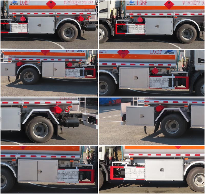 罐体尺寸:罐长3.8米,长轴1.6米,短轴0.9米,总容量4.3立方米,有效容积4.09立方米.侧后防护材质均为Q235,螺栓连接.后防护截面尺寸为120x60(高x宽)毫米,下平面距地高为375毫米.装备限速装置,限速80km/h;前轴装备盘式制动器;排气管前置.仅采用底盘子午线轮胎.该车转向轮已随底盘装备轮胎爆胎应急防护装置.安装具有卫星定位功能的行驶记录仪.危险货物运输车辆的车辆类型FL.准运介质密度最大值为830千克/立方米.ABS型号:CM4XL-4S/4M,VIE ABS-Ⅱ;ABS生产企业:广州瑞立科密汽车电子股份有限公司,浙江万安科技股份有限公司.该车可选装ETC车载装置.加油机型号/厂家:JSK-70B1121CZ/稳恩佳力佳(北京)石油化工设备有限公司,CS20D1110F/正星科技有限公司,BL1111Z/珠海市贝林加油设备有限公司.选装:灭火器筒安装位置、挡泥板样式、左右两侧中部长箱子、摄像头及支架、软管筒端盖样式、右侧后悬处箱子规格、箱门铰链样式. |