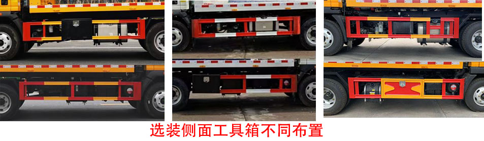 托举质量(kg)/整备质量(kg)/准乘人数(人)对应关系为:4470/4500/2,4405/4500/3,4070/4900/2,4005/4900/3,3720/5250/2,3655/5250/3,3370/5600/2,3305/5600/3,3020/5950/2,2955/5950/3。外形尺寸长/轴距/前悬/后悬/后伸对应关系(mm)为:6400/3280/1180/1940/0,6400/3280/1160/1960/0,7380/3600/1180/2310/290,7380/3600/1160/2330/290,7580/3800/1180/2310/290;主要专用装置为托举装置、平板、液压绞盘,用于清除道路障碍物。侧防护装置材料材质:Q235,侧防护螺栓连接,后下部防护装置因工作装置干涉无法安装,后部专用装置非作业状态下的离地高度为480mm。ABS系统型号为XH-KQ4S4M-E01,生产企业为广州市西合汽车电子装备有限公司;型号为CM4XL-4S/4M,生产企业为广州瑞立科密汽车电子股份有限公司;型号为VIE ABS-Ⅱ,生产企业为浙江万安科技股份有限公司.随底盘选装驾驶室,选装轮辋风格,选装侧面工具箱不同布置. |