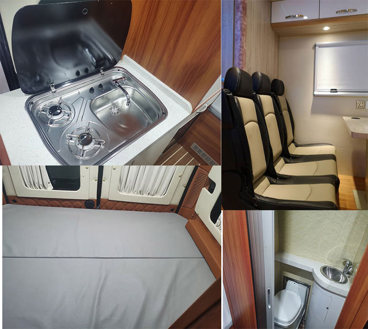 凌扬牌上汽大通国六B型旅居车在外观时尚霸气造型圆润流畅,可有效降低风阻系数,整车外形尺寸为5990×2200×2755,2850,2555(mm),房厢采用玻璃钢复合车身结构及阻燃保温材料,做工精细;房厢内部配置齐全,床,洗手间,厨房,冰箱,,储物仓,暖气设备,灭火器等等。