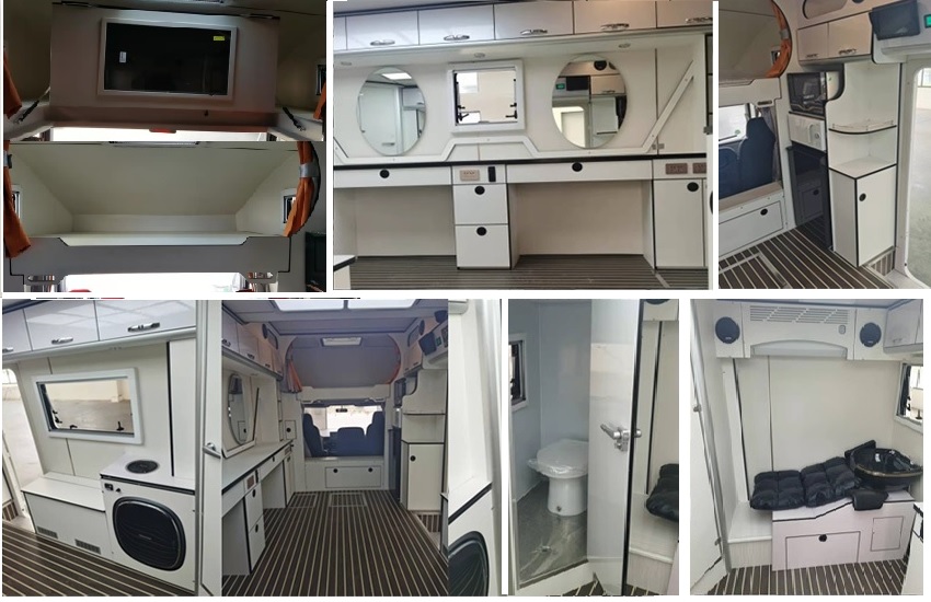 程力牌上汽跃进国六平头流动服务车在外观时尚霸气造型圆润流畅,可有效降低风阻系数,整车外形尺寸为5995×2450×3200(mm),厢体采用玻璃钢复合车身结构及阻燃保温材料,做工精细;房厢内部配置齐全。