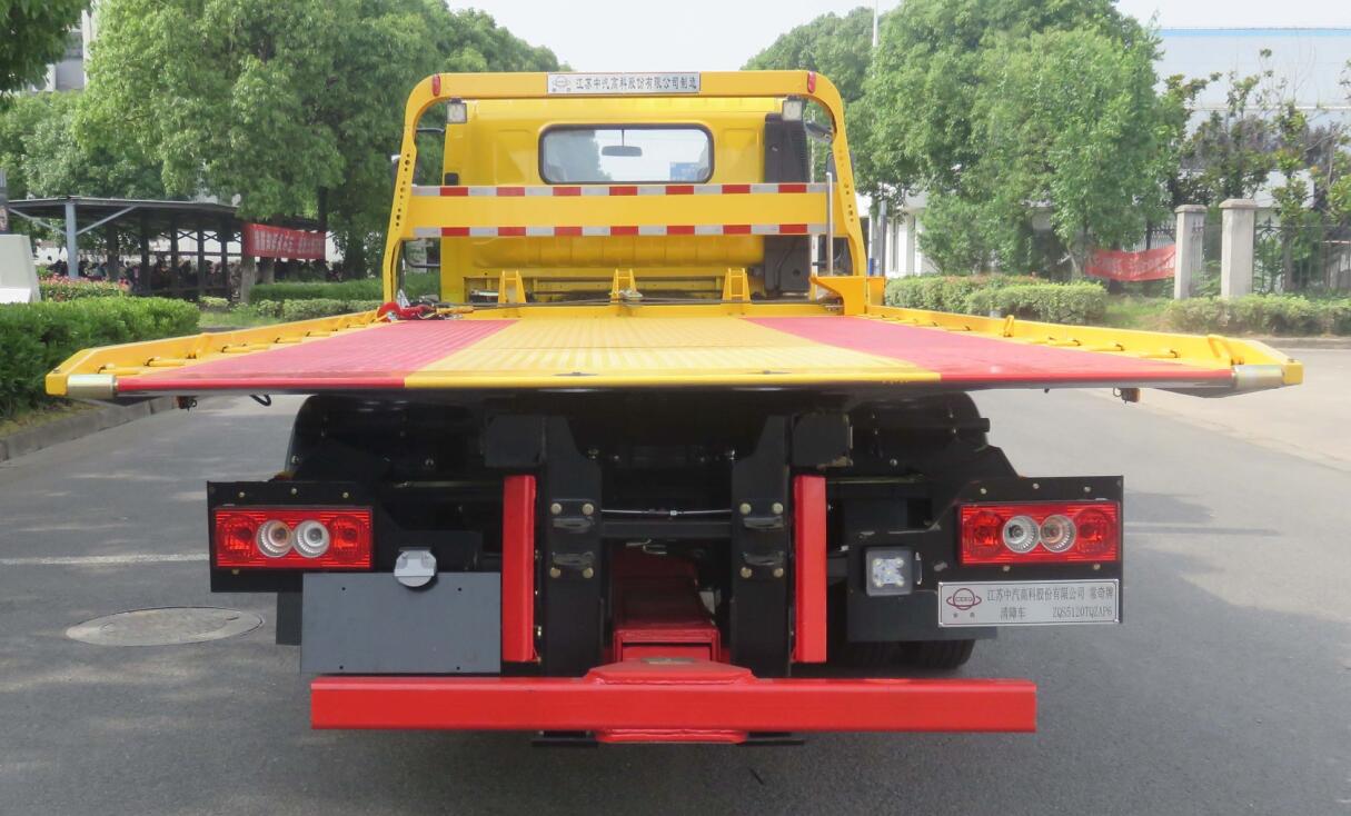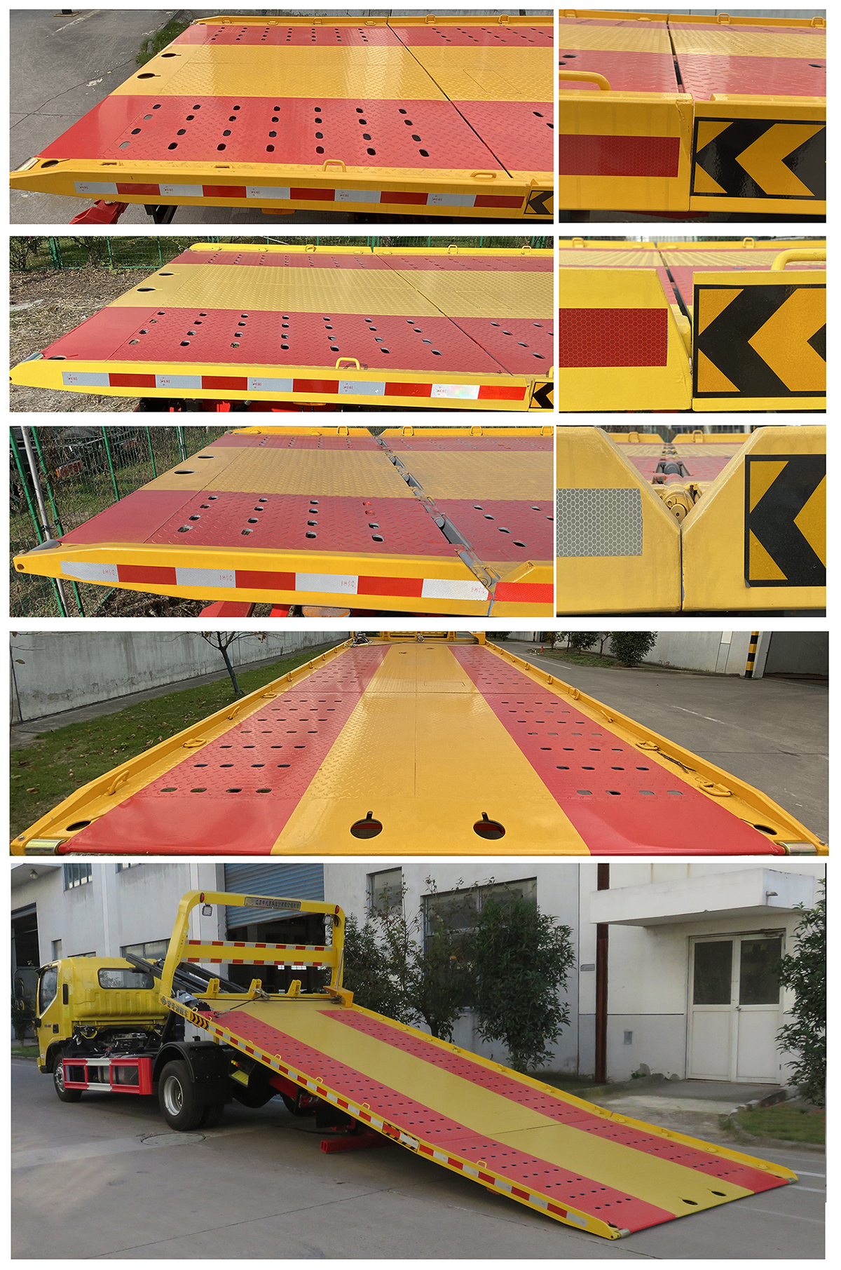 托举质量4875kg。该车选装上坡辅助液压尾板结构时仅外观变化,对应的整备质量无变化(上坡辅助液压尾板收起状态的水平长度为150mm);选装加强型结构时外观不变,对应的整备质量为7190kg,托举质量为4535kg;选装轻量化上装结构时外观不变,对应的整备质量为6230kg,托举质量为5495kg。侧防护与底盘纵梁间采用螺栓联接,材质为Q235A;后部是清障车专用托举装置替代后防护, 离地高度420mm;ABS系统型号:ABS-VI.E,生产企业:广州瑞立科密汽车电子股份有限公司;ABS系统型号:ABS-E,生产企业:威伯科汽车控制系统(中国)有限公司;该车随底盘选装排半驾驶室;该车仅用4200mm轴距;该车选装宽度2490mm。专用功能及装置:该车用途为道路故障车辆,城市违章车辆托运;主要专用装置有平板机构,绞盘及托臂机构。该车型可选装ETC车载装置。该车可选装折叠口样式不同的平板。 |