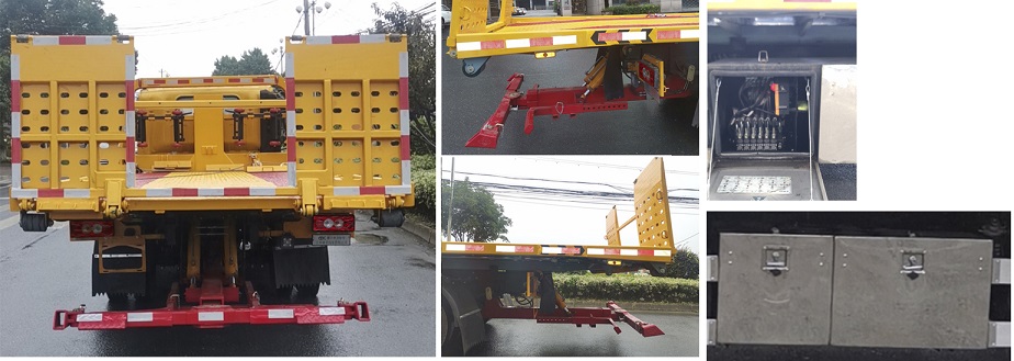整备质量为6900kg时托举质量为2900kg,整备质量为6300kg时托举质量为3500kg;该车用途为道路故障车辆、城市违章车辆托运;主要专用装置有平板机构、绞盘及托臂机构;侧防护材质为铝合金,连接方式:螺栓连接;后防护由车身专用装置替代,离地高度480mm;选装后部结构,后部尾板收起状态的水平长度为150mm或70mm;ABS系统控制器型号/生产企业:ABS-E/威伯科汽车控制系统(中国)有限公司;选装托臂样式及选装双工具箱;选装操作手柄的安装位置(工具箱内); |