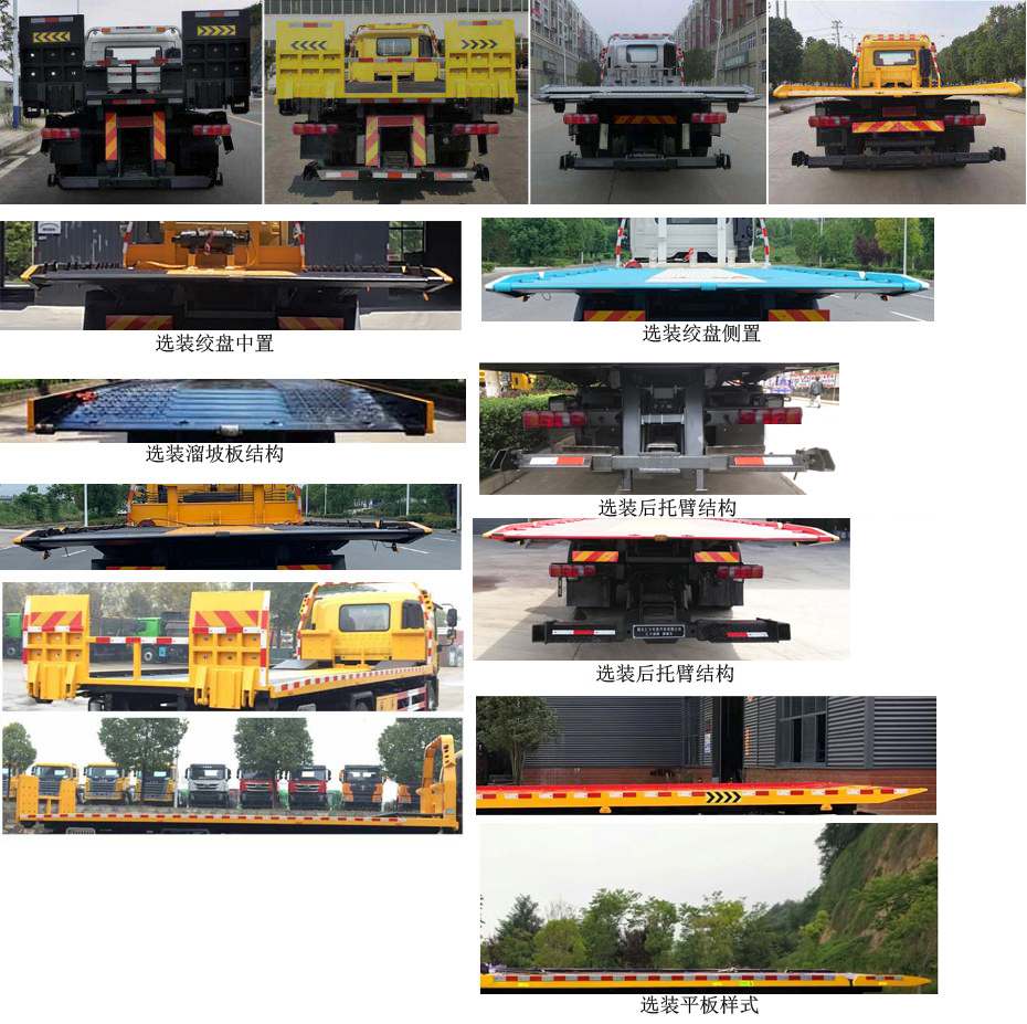 随底盘选装驾驶室,选装限速装置,限速89km/h。选装后部结构;选装后部翻转板结构及样式,选装溜板结构,选装后托臂结构,选装平板样式,选装绞盘中置,选装绞盘侧置;仅采用底盘5600mm轴距。托举质量6370kg,6305kg,5370kg,5305kg。主要专用装置为托举装置、平板、液压绞盘,用于清除道路障碍物。侧防护装置材料材质:Q235,连接方式:焊接;后下部防护装置因工作装置干涉无法安装,后部专用装置非作业状态下的离地高度为470mm。ABS型号1:446 004 6300,ABS生产企业1:威伯科汽车控制系统(中国)有限公司;ABS型号2:CM4XL-4S/4M,ABS生产企业2:广州瑞立科密汽车电子股份有限公。 |